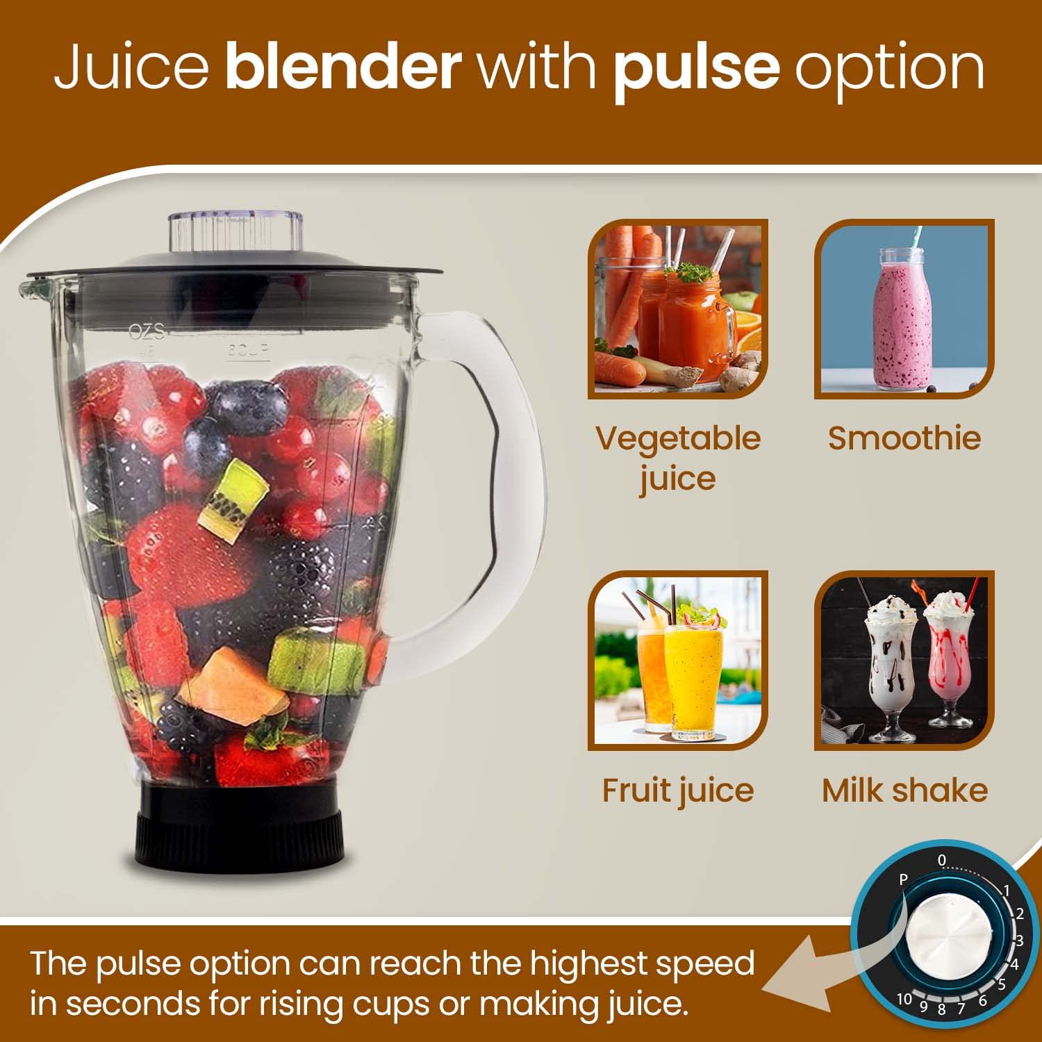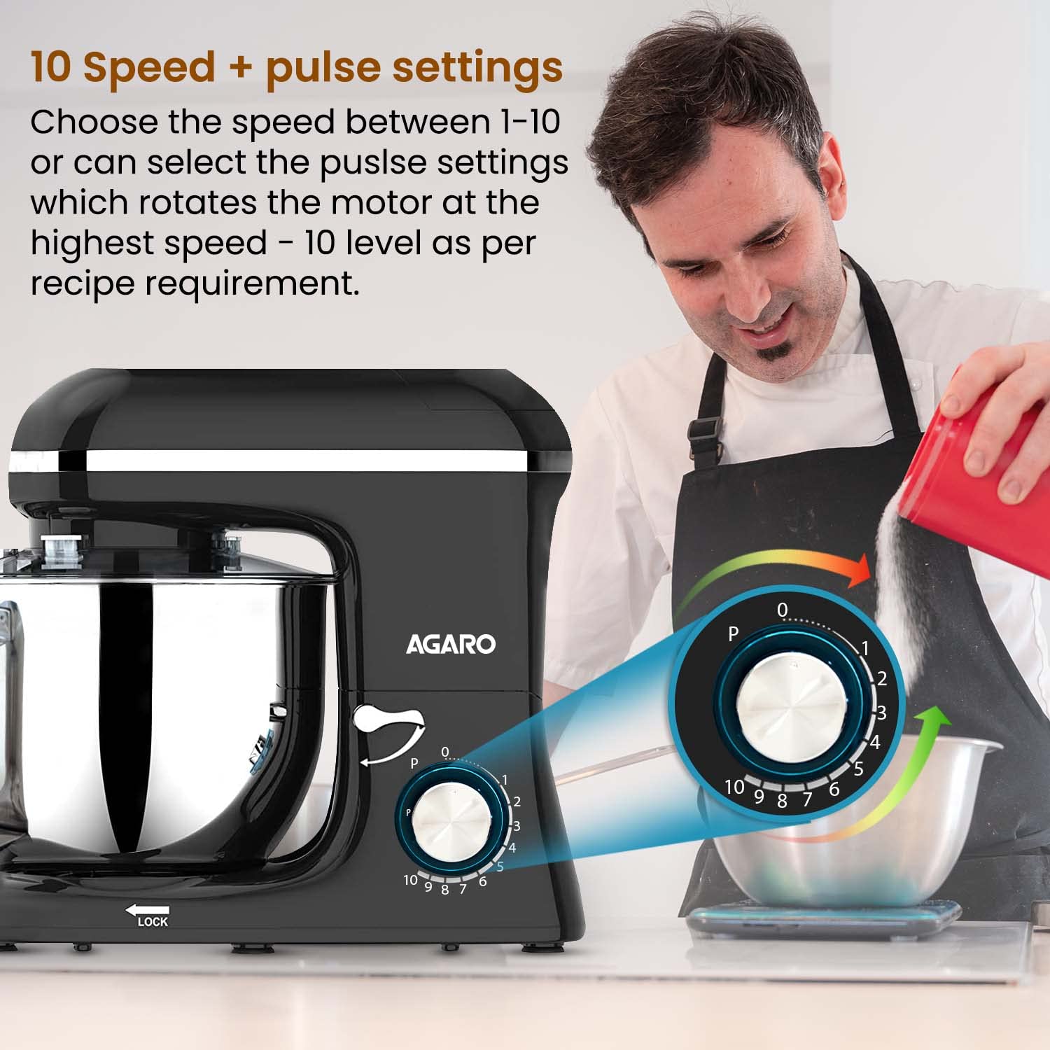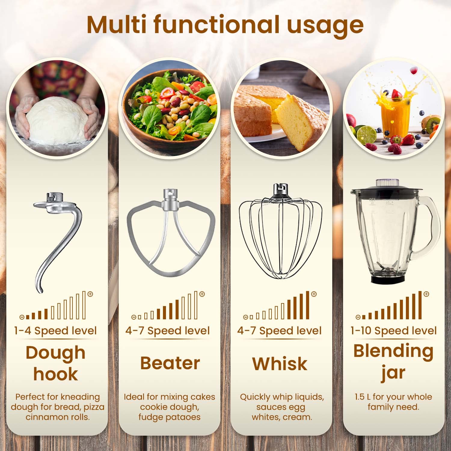 - 10 speed levels and pulse function supports doughing, beating, whisking for making various recipes like bread, roti, cake, cookies, muffin and much more. Use dough hook within speed of 1-6, beater within speed of 1-7, whisker within speed of 8-10. Use PULSE function for quick blending as per need