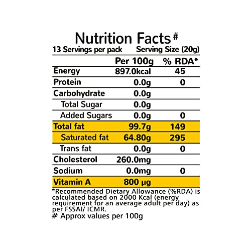 - Certified Organic: Made using cream of organic milk free from antibiotics, induced hormones, additives, and chemical residues—protecting the natural flavor and nutrition of the ghee.