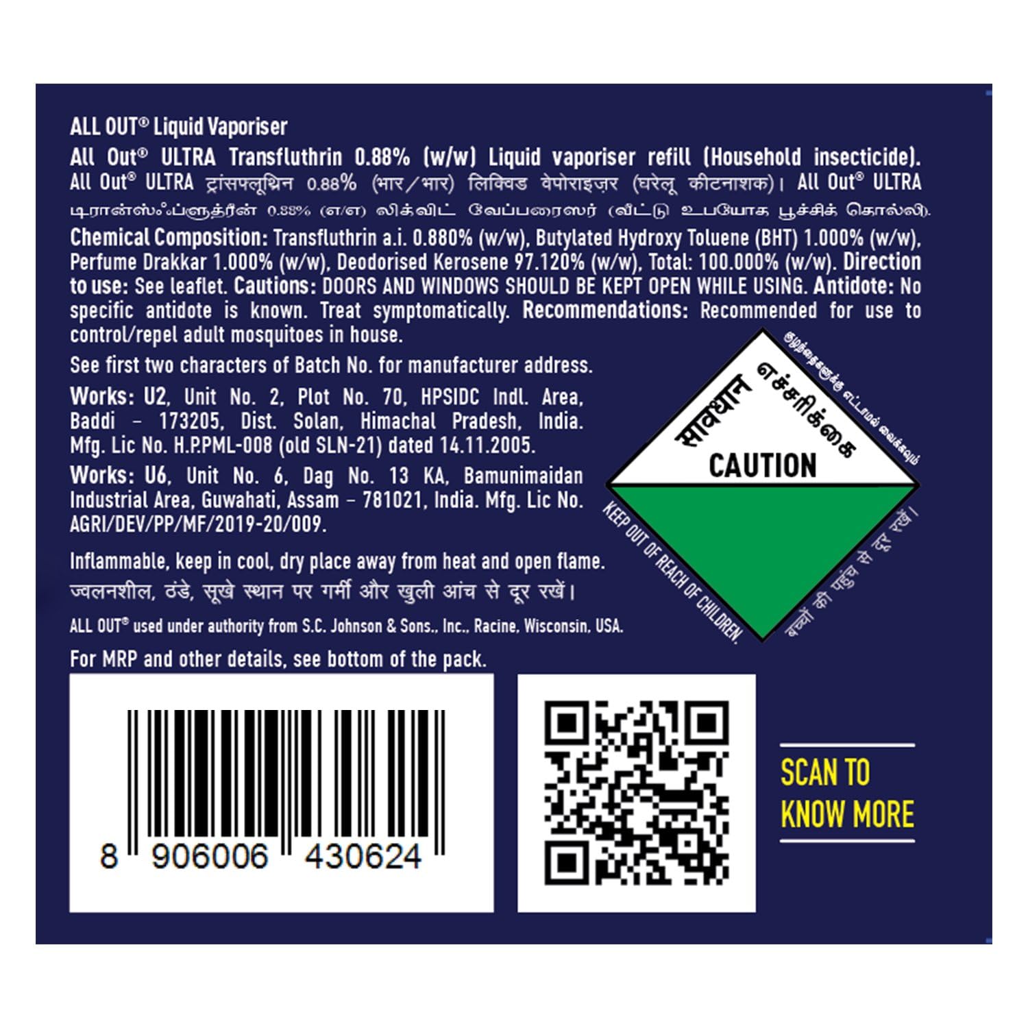 - Kills Disease Causing Mosquitoes: All Out Ultra Liquid Vaporizer effectively kills Dengue, Malaria, and Chikungunya spreading mosquitoes and keeps your family protected.