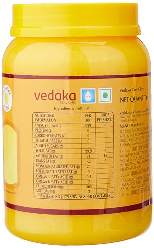 Details: Introducing the Amazon Brand - Vedaka Desi Cow Ghee. Made from indigenous cows' milk, the ghee is 100% pure. It does not contain any added preservatives and hence, provides you with an authentic taste and aroma. As the ghee features low moisture content and natural antioxidants, it has a stable shelf life. Moreover, ghee is an important carrier of fat-soluble vitamins. It contains short and medium-chain fatty acids which can be absorbed easily by the body and hence, is the perfect aromatic for your dishes. You can cook curries, make desserts, baste rotis, and more with the Amazon Brand - Vedaka Ghee.