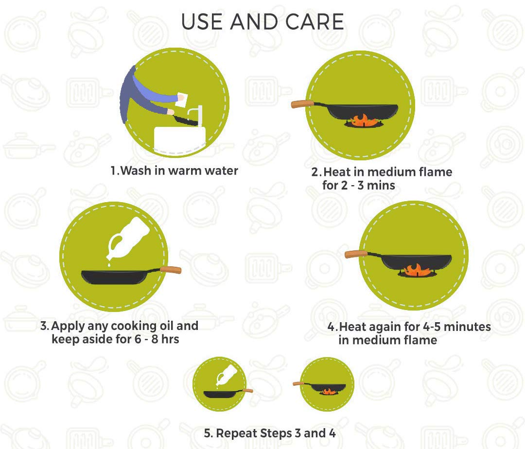 - EASY TO CLEAN - Fry an onion before use to remove if any carbon or rust deposited on the surface to clean the pan tawa, use lemon and baking soda with warm liquid soapy water and use steel scrubber to clean. after cleaning wipe it dries with a cloth and spread oil on all iron pan tawa surfaces.