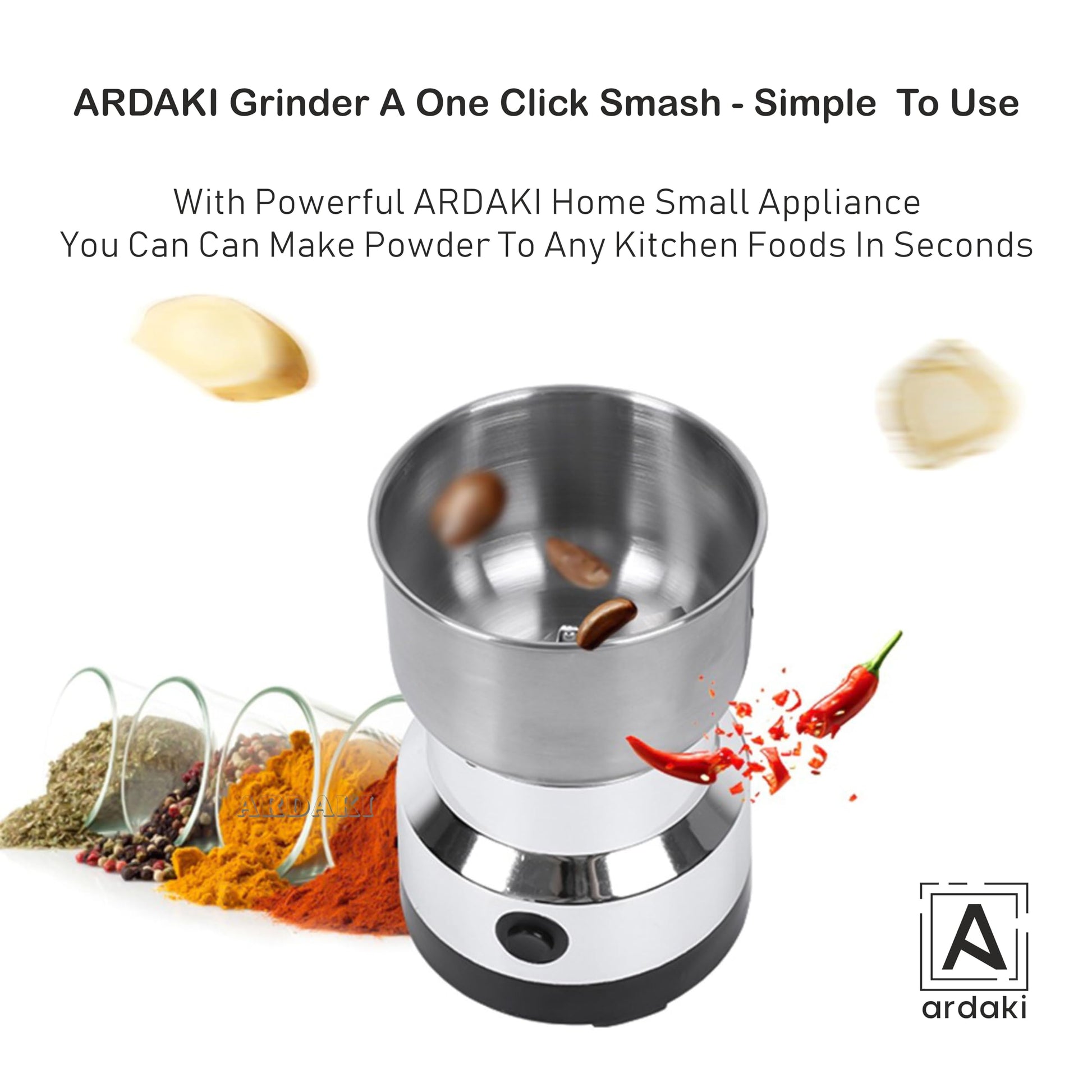 From coffee beans to herbs, spices, nuts, grains, and seasonings, this multifunctional powerhouse can handle it all. With the ARDAKI Mixer Grinder, you can effortlessly grind ingredients to your desired consistency, whether you're whipping up a morning cup of joe or adding a burst of flavor to your favorite dishes.