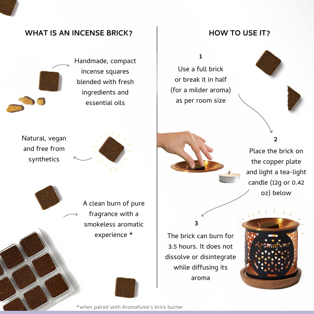 - HOW TO USE: Use this low-smoke, non-toxic incense by placing a brick on the copper plate of our custom exotic burner and lighting a tea light candle below it. These bricks are traditionally prepared using sustainably sourced natural Resins for their aromatic and cleansing properties. We recommend tea-light candles with a 3.5 to 4 hour burn time. Each incense brick has a burn time of 3.5 hours