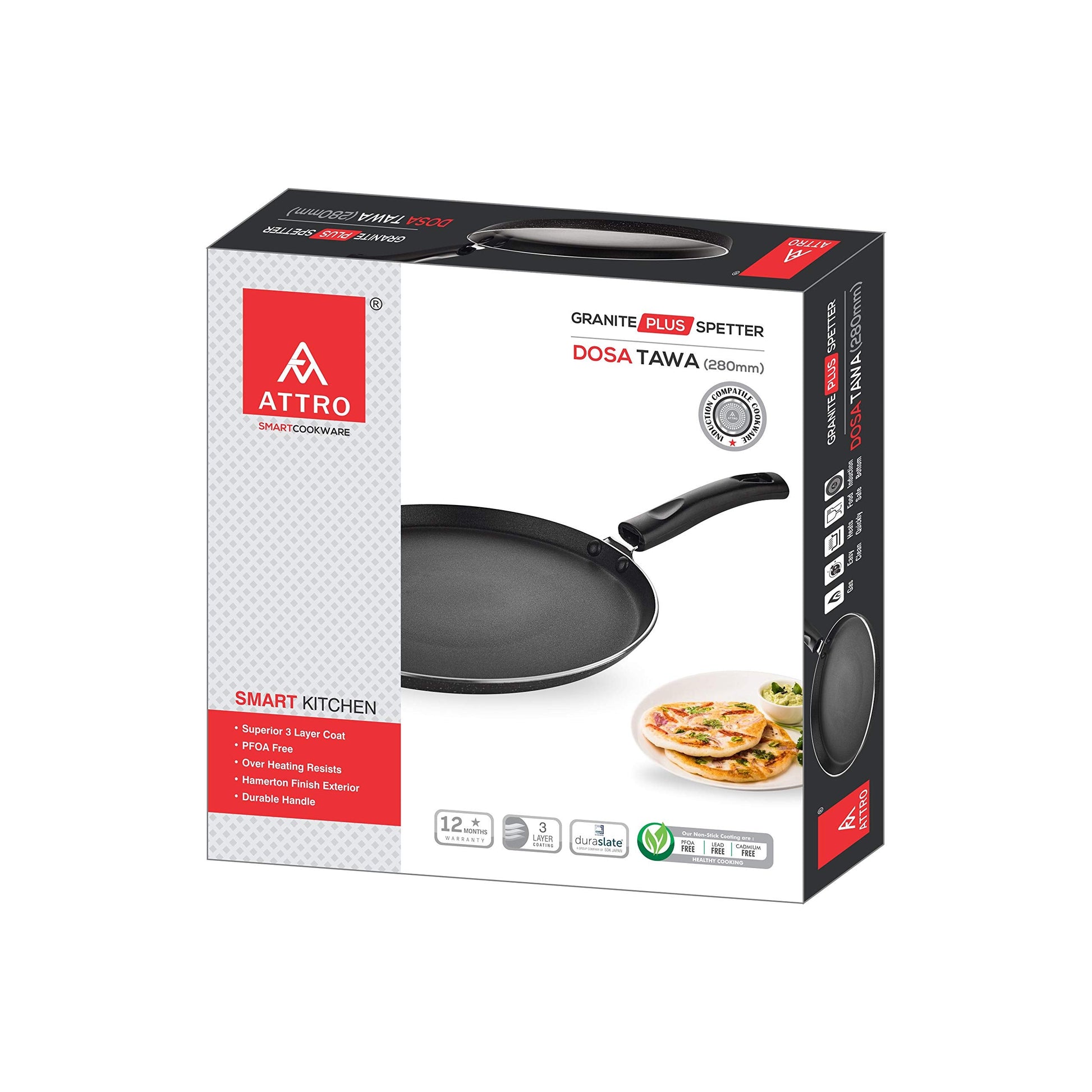 Details: Attro comes with variety of superior quality products. Dosa Tawa is made from pure grade virgin aluminum which aids in faster cooking and even heat distribution. This ergonomically designed non-stick dosa tawa. It can be used on cooking appliances such as stove top, gas cooktop, induction. Made from aluminium, the Dosa Tawa Non-stick 3 layer ensures high heat conductivity, thereby providing high efficiency while cooking. Featuring a non-stick coating, this dosa tawa can greatly reduce your oil consumption, resulting in healthier meals for you and your family. Featuring an ergonomic handle that stays cool while being used on the stovetop, you can easily handle this pan without worrying about burning your hands.