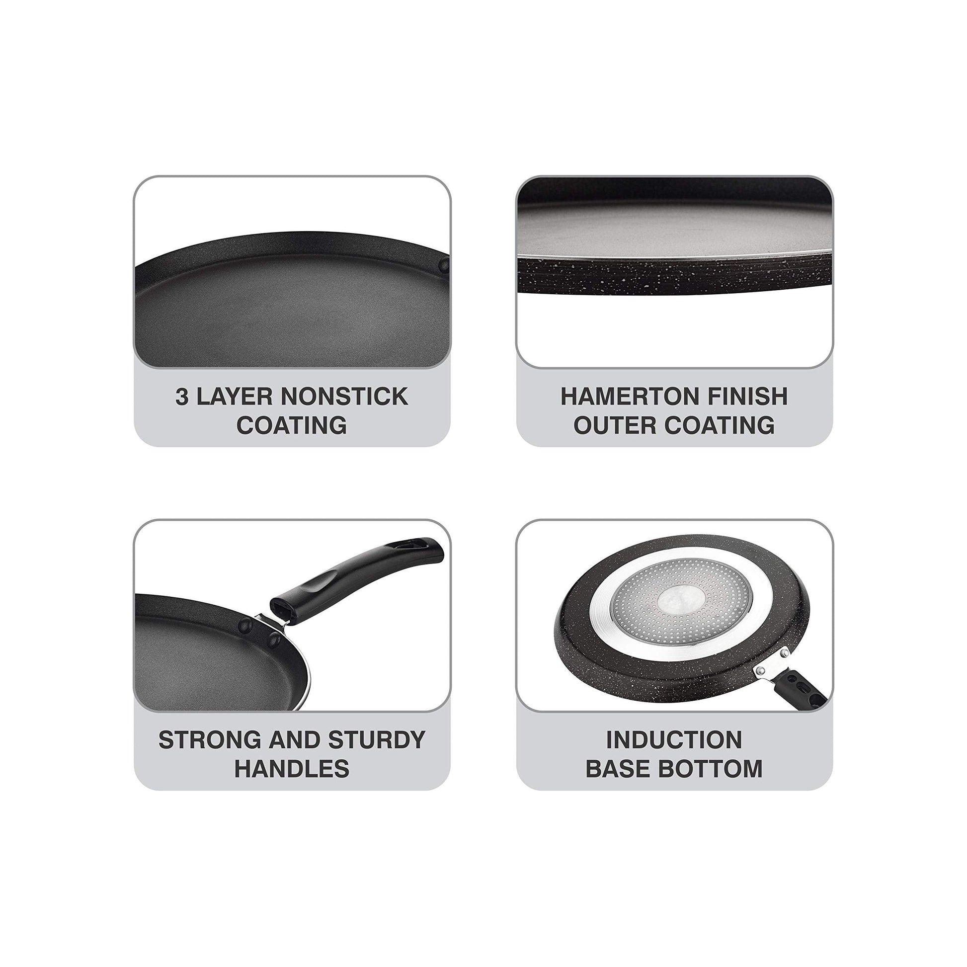 - Material: Aluminium; Finish: Non Stick; Size: Dosa Tawa (280 mm); Base type: Gas Top & Induction Base; Base Thickness; 3mm; Included components: 1 Dosa Tawa; Colour: Marble Grey