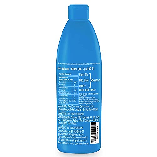 Details: Bajaj Coconut oil- is made from the finest coconuts. Bajaj 100% Pure Coconut oil contains only the goodness of finest coconuts. It is made from naturally sourced coconuts of premium quality. The oil is extracted from the nuts through a hands free process. It goes through multiple stages of purification and quality tests Tamper proof seal ensures that the rich aroma of raw coconuts is preserved for a long time. It contains no added chemicals, scent, additives or preservatives. It is licensed by FSSAI as an edible grade coconut oil. Bajaj Coconut Oil is available in 600g & 500g pack.