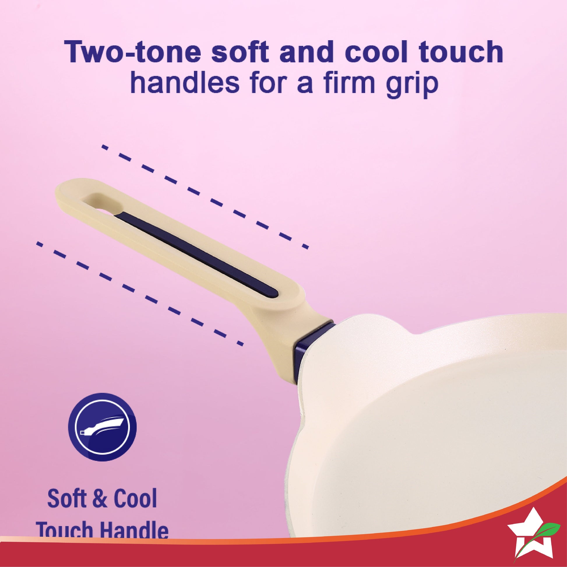 - The ergonomically designed two-tone soft touch handles and knob provide a firm grip, do not heat up while cooking and are a delight to hold.