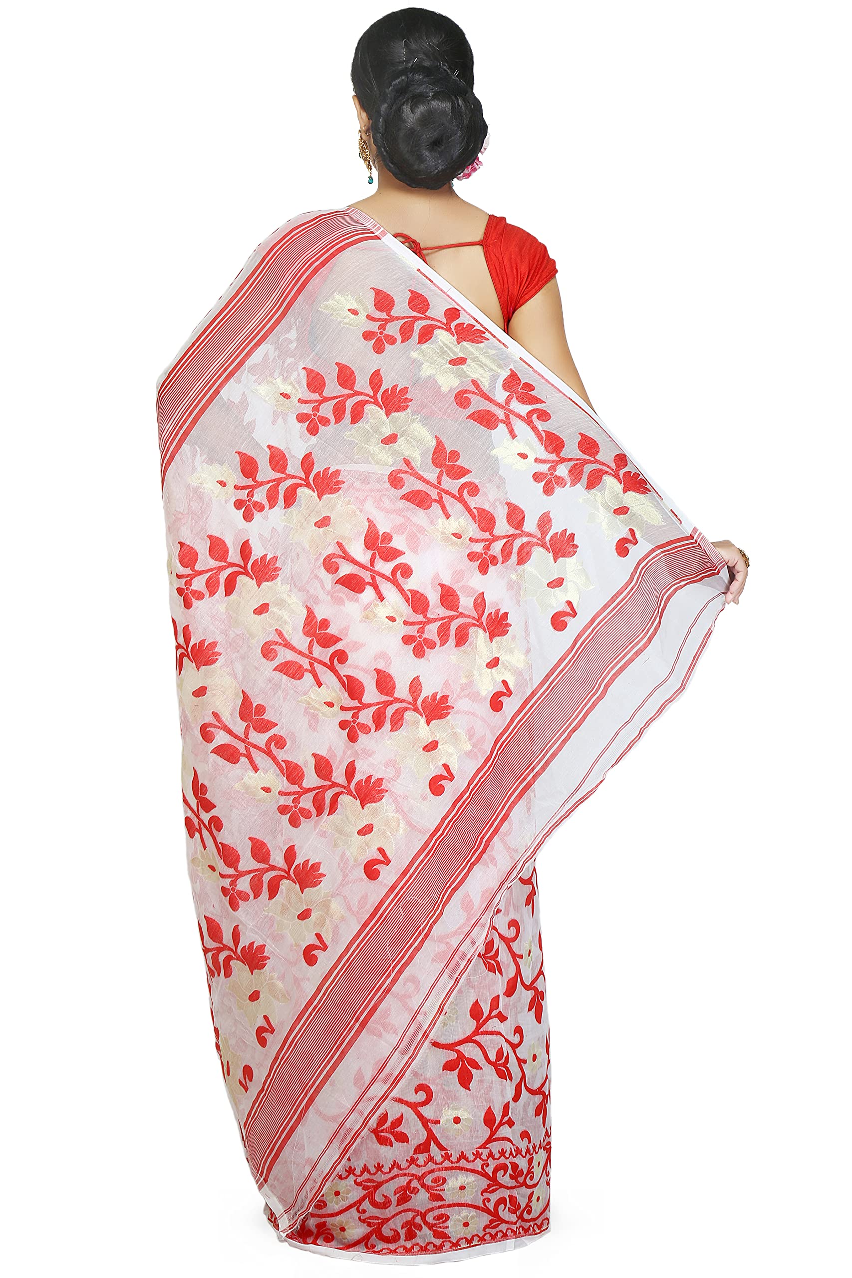 BENGAL HANDLOOM Exclusive Women's Cotton Silk Dhakai Allover Soft Jamdani Sarees (White & Red)