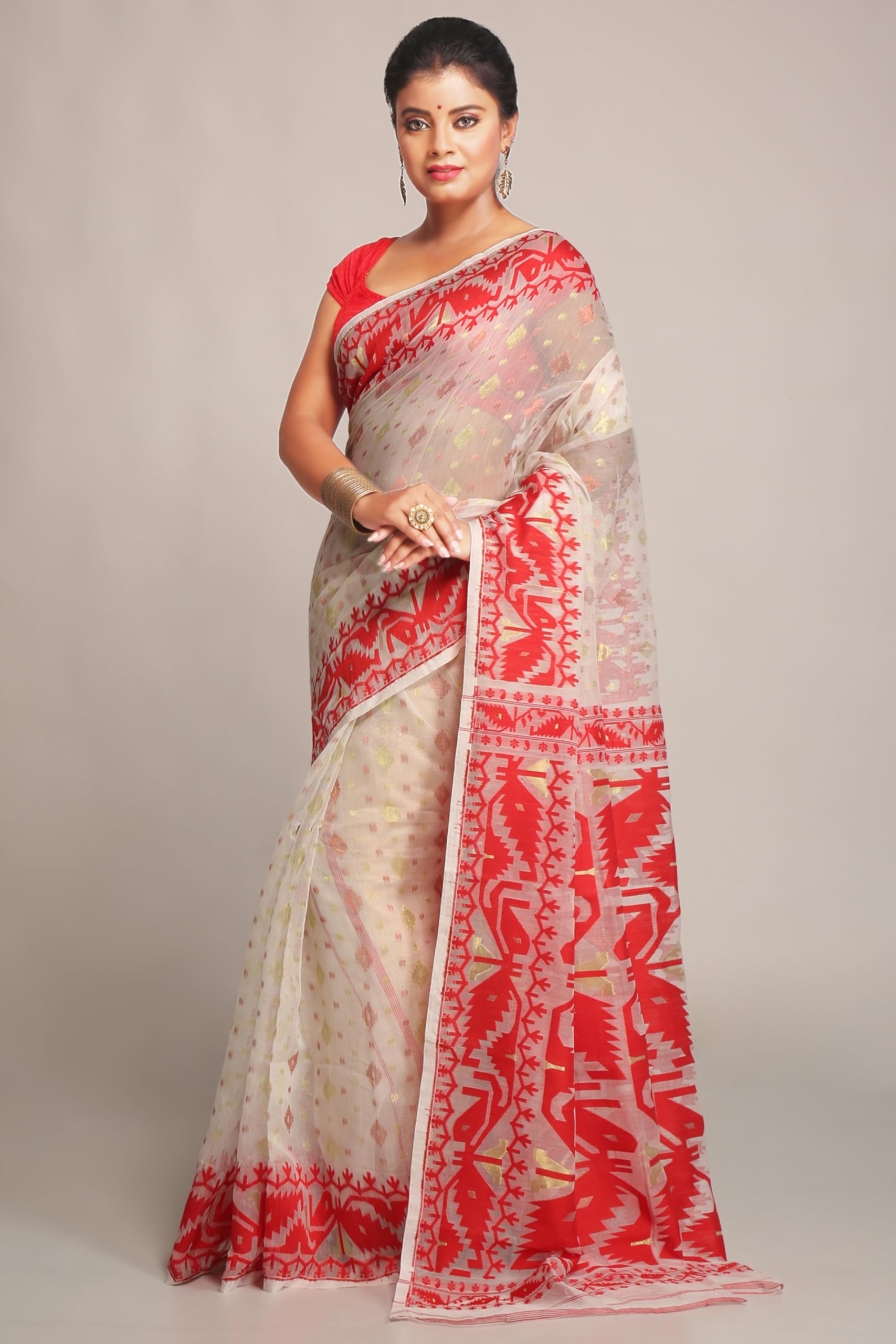 BENGAL HANDLOOM Women'S Cotton Silk Softs Dhakai Jamdani Sarees (White & Red)