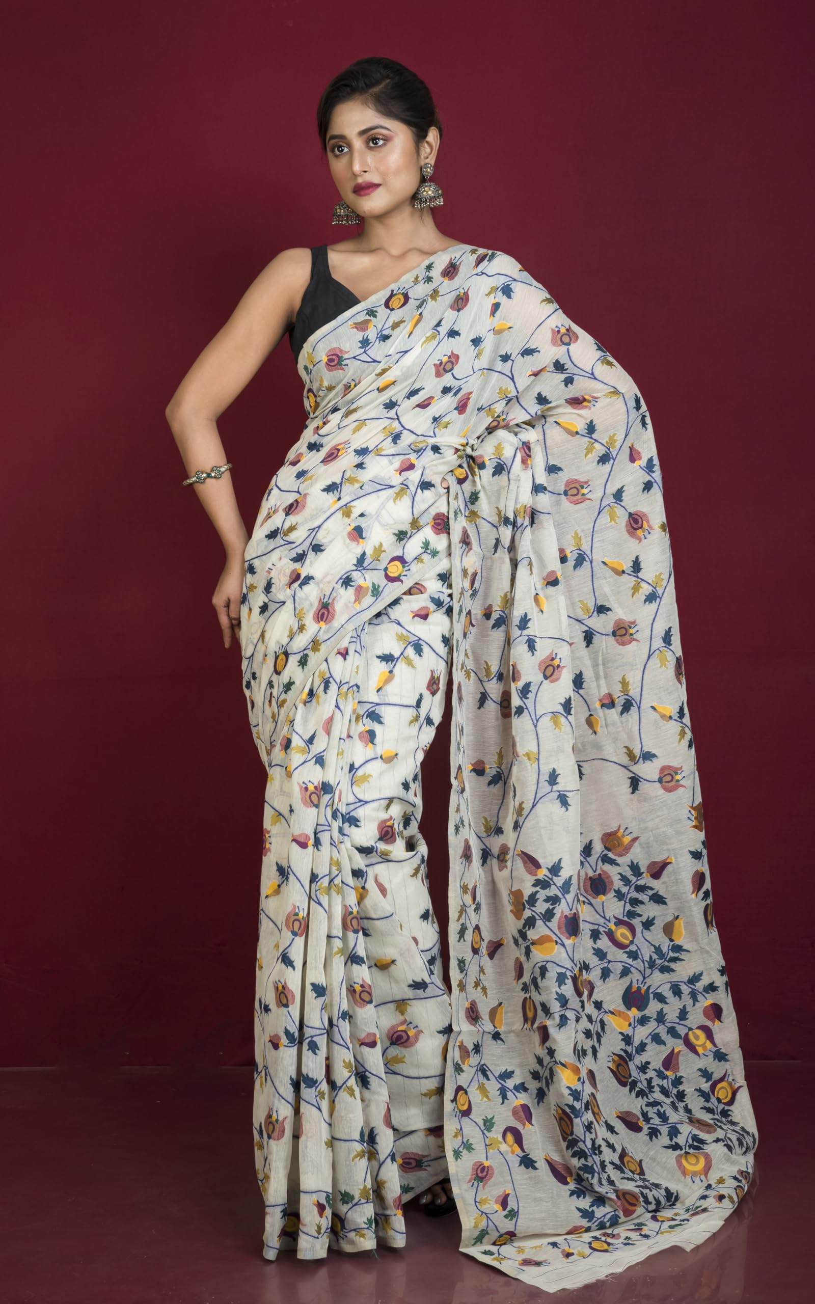 BENGAL LOOMS INDIA Tantuja Inspired Traditional Karat Nakshi Work Soft Jamdani Saree Women Rich Texture Smooth Finish Sari Indian Tradition Saree in Stone Beige and Multicolored for Casual Formal Wear