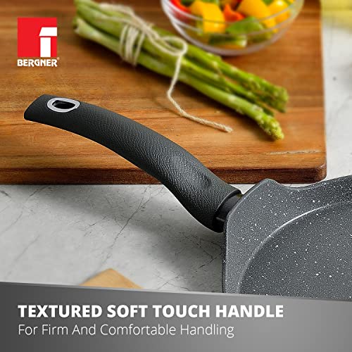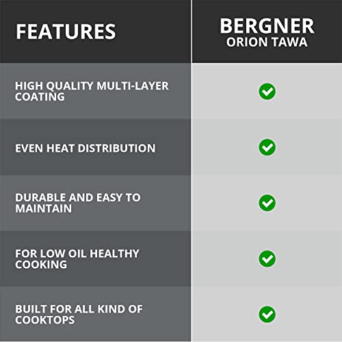Details: Description BERGNER Orion Marble Non-Stick Tawa – For a healthier and tastier food. Bergner presents premium non-stick cookware to unveil your culinary skill and bring out the best of your recipes for your family and friends. Forged from highly durable metal and coated with a nontoxic multi-layer non-stick coating, the cookware lasts longer without compromising its shape and the non-stick surface. Our design inspiration comes from nature with carefully chosen elements like the rare snakeskin-like textured handles, Italian Granite Marble-inspired exterior and interior. Not only the design inspiration but also this cookware helps preserve nature with Zero wastage with its 100% recyclable design. Built for all types of cooktops, this can cook on any heat source, especially on induction, where it outshines any other modern cookware available in the market due to its energy-saving fast and even heat distribution ability. The cookware has beautiful chrome inserts in the handle for that premium-looking feel in your hands and kitchen shelves. The non-stick surface provides smoothness to cook virtually without any oil. The material can withstand high temperatures without losing its shape. Bergner recommends cooking below 300° Celsius for all non-stick pots and pans.