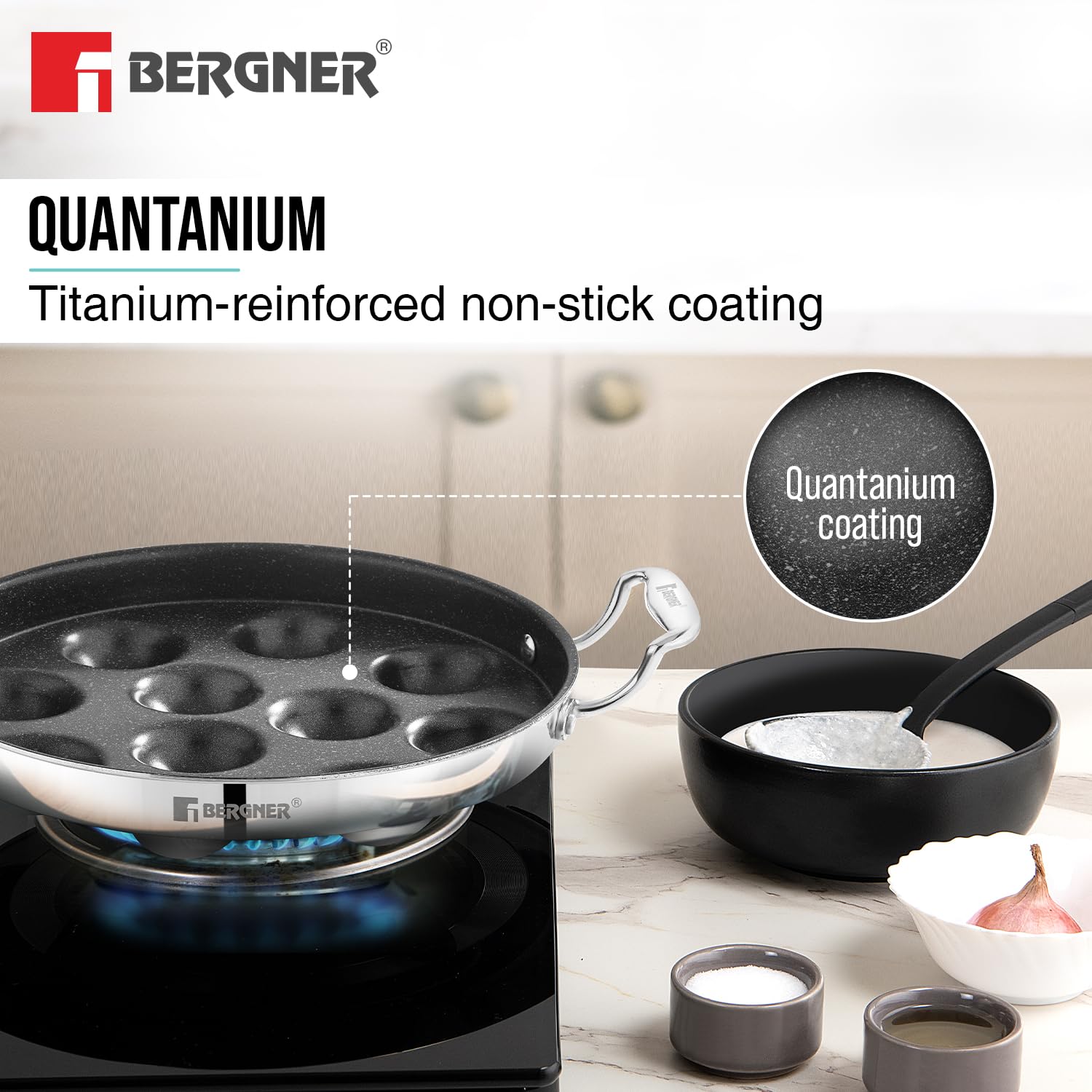BERGNER Argent Samsara Triply Stainless Steel 11 Pits (25cm) Round Paniyarakkal with Glass Lid, Paniyaram with Quantanium Non-Stick Coating, Consumes Less Oil, Healthy Cooking - Induction Compatible