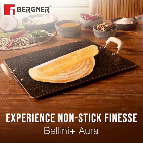 Bergner Bellini Plus Aura 5-Layer Non-Stick 30cm Pathri Tawa, Flat Rectangle Pathri Tawa with Soft Touch Wooden Finish Handle, PFOA Free, 4mm Thickness, Induction Bottom, Black