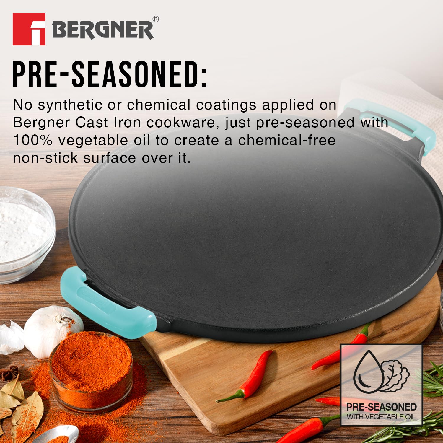 Bergner Eco Cast Iron 30cm Dosa Tawa, Pre-Seasoned, Large Loha Tawa for Dosa, Even Heat Distributor, Retains Heat to Enhance Flavor, Comes with Silicone Sleeve - Induction Base and Gas Stove Ready