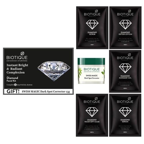 | DESCRIPTION Dirt, pollution, stress – everything combines to make skin look older than the actual age. The cleansing, scrubbing, massaging and pampering of the diamond facial will bring out younger, fresher cells to the surface, making look skin younger and brighter. | | INGREDIENTS THIS PACK CONTAINS: 1.DIAMOND SCRUB -10gm 2.DIAMOND SERUM-10gm 3.DIAMOND MASSAGE GEL-10gm 4.DIAMOND WASH OFF MASK -10gm 5.DIAMOND DETOX LOTION -10gm 6.SWISS MAGIC DARK SPOT CORRECTOR -15gm | | HOW TO USE? STEP 1: DIAMOND SCRUB:Enriched with Diamond Bhasma & Almond. It exfoliates the dead cells, removes impurities and polishes the skin. Apply evenly on the face and leave it for 3 minutes and then with circular massage exfoliate the dead skin cell. Wipe the face and proceed for step 2. STEP 2: DIAMOND DETOX LOTION:Enriched with Diamond Bhasma coconut oil and neem that enhance skin natural mechanism and provide a protective layer over skin. Apply the lotion evenly on the skin. STEP 3: DIAMOND MASSAGE GEL:Enriched with Diamond Bhasma, Mulethi root, Almond oil to fight against ageing and pollutants. Massage for 15 minutes and proceed for step 4. STEP 4: DIAMOND WASH OFF MASK:Enriched with Diamond Bhasma and Jasmine leaf that deeply cleanses face, make skin even toned healthy & radiant. Apply evenly and leave it for 12 minutes and wipe it thoroughly. Proceed for step 5. STEP 5: DIAMOND SERUM:Concentrated Serum enriched with botanical extract to provide brightness to the skin. Apply the serum and penetrate while massaging. STEP 6: SWISS MAGIC DARK SPOT CORRECTOR:A concentrated formula with light melting fresh texture that helps to prevent and correct dark spots and signs of ageing while balancing the skin's tone and minimizes hyperpigmentation, while maintaining the extraordinarily uniformity, luminous and youthful skin. Apply Dark Spot Corrector to the specific area of concern. | Country of Origin: India Name of Mfg / Importer / Brand: Bioveda Action Research Company Address of Mfg / Importer / Brand: 42, Rampur Ghat Rd, Paonta Sahib, Himachal | | |