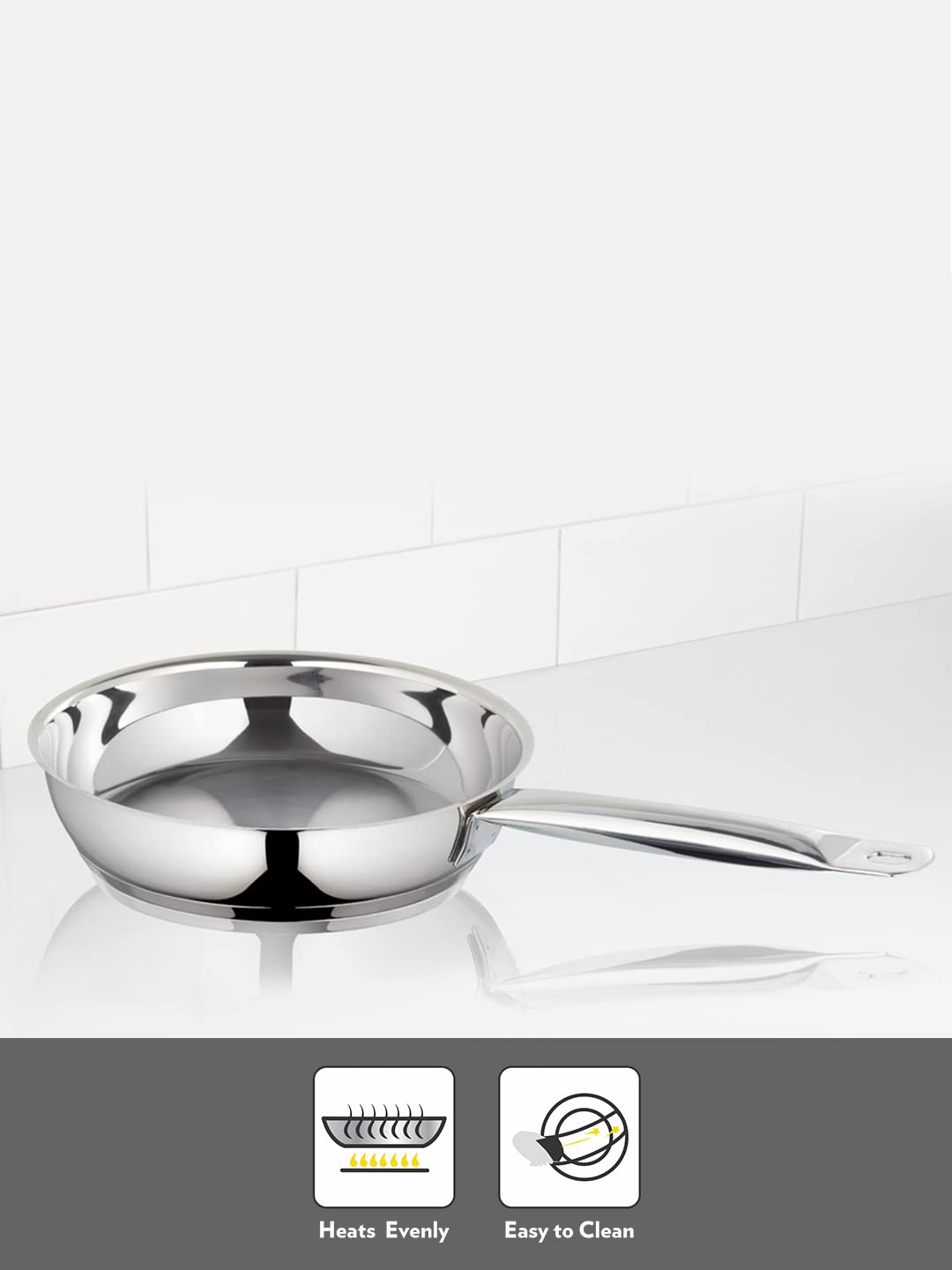 - MADE OF HEAVY GAUGE STAINLESS STEEL - The versatile fry pan is a mainstay of any kitchen. The Borosil stainless steel frying pan with a tri-ply bottom is one such utensil . Designed to last long owing to the heavy gauge stainless steel, this fry pan has been crafted to deliver memorable meals. You can use the frying pan to cook scrambled eggs, omelettes, fried eggs, burger patties, aloo tikkis, pancakes, sauteed vegetables and more!