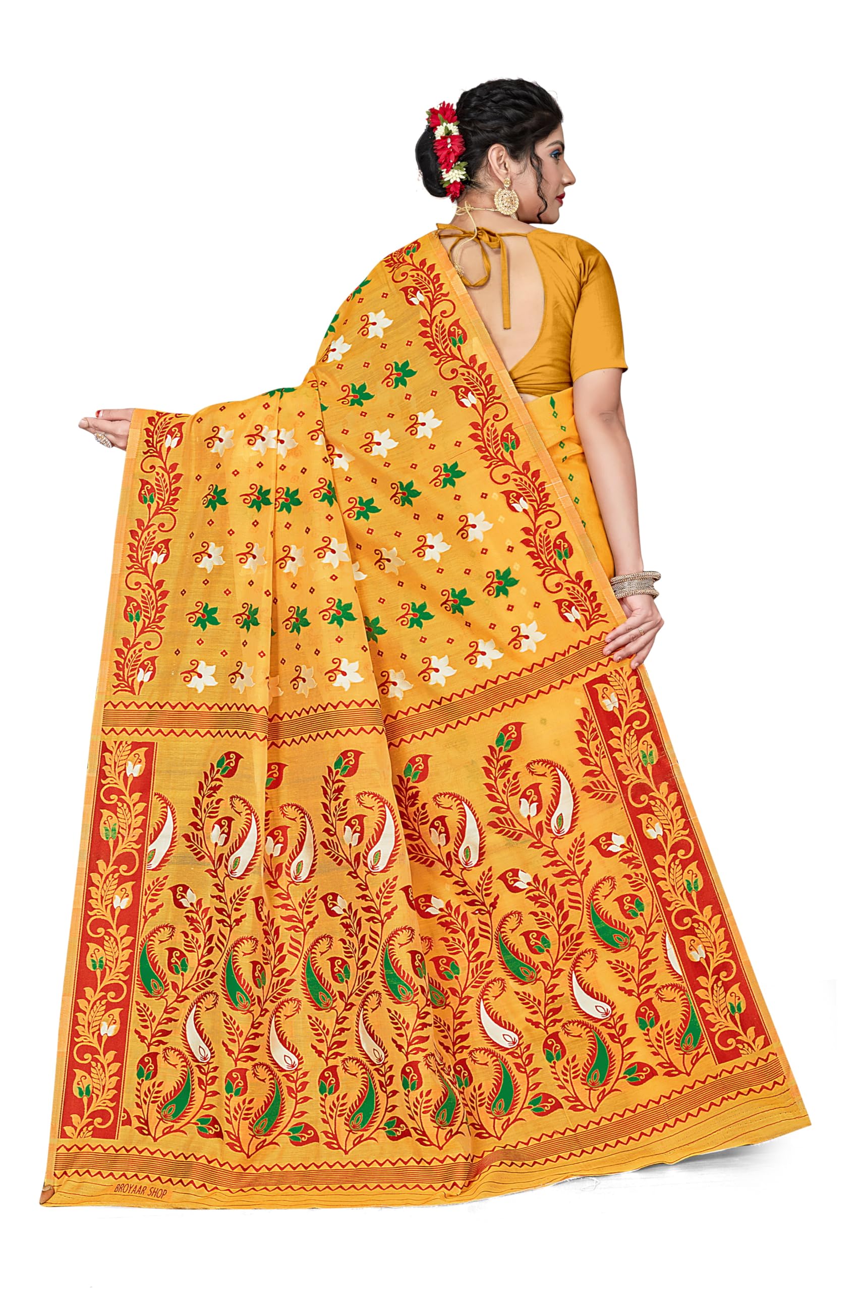 BROYAAR SHOP Women Soft Resham Dhakai Jamdani Relaxed Fit Blend Silk Saree Whole Body Design Without Regular Fit Blouse Piece(Gold)