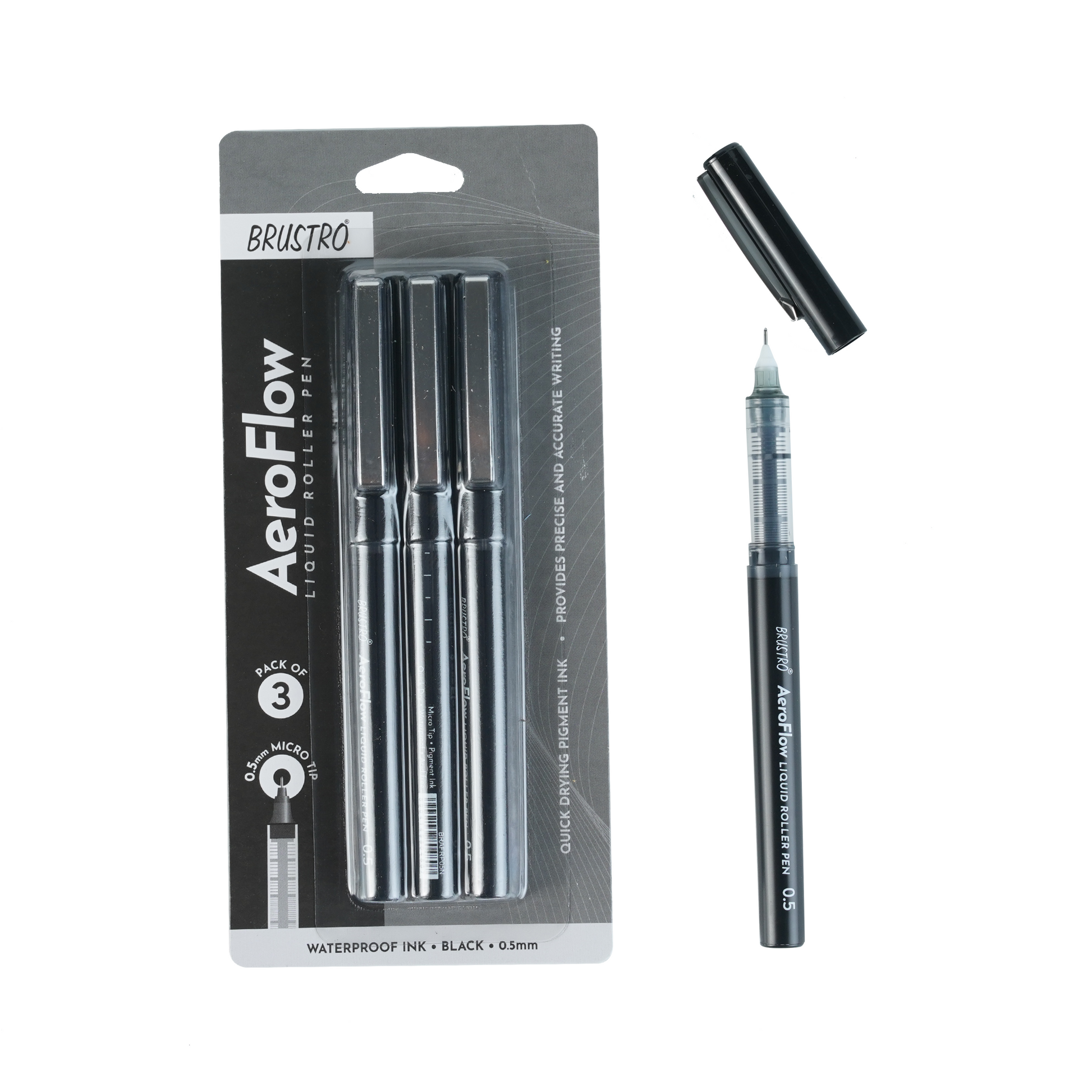 BRUSTRO AeroFlow Liquid Ink Rollerball Pens | Black | 0.5mm, Micro Tip | Pack of 3 | Ideal for Students, Professionals, Office, Exam use, Accurate Smooth Writing, Waterproof, Fade Resistant