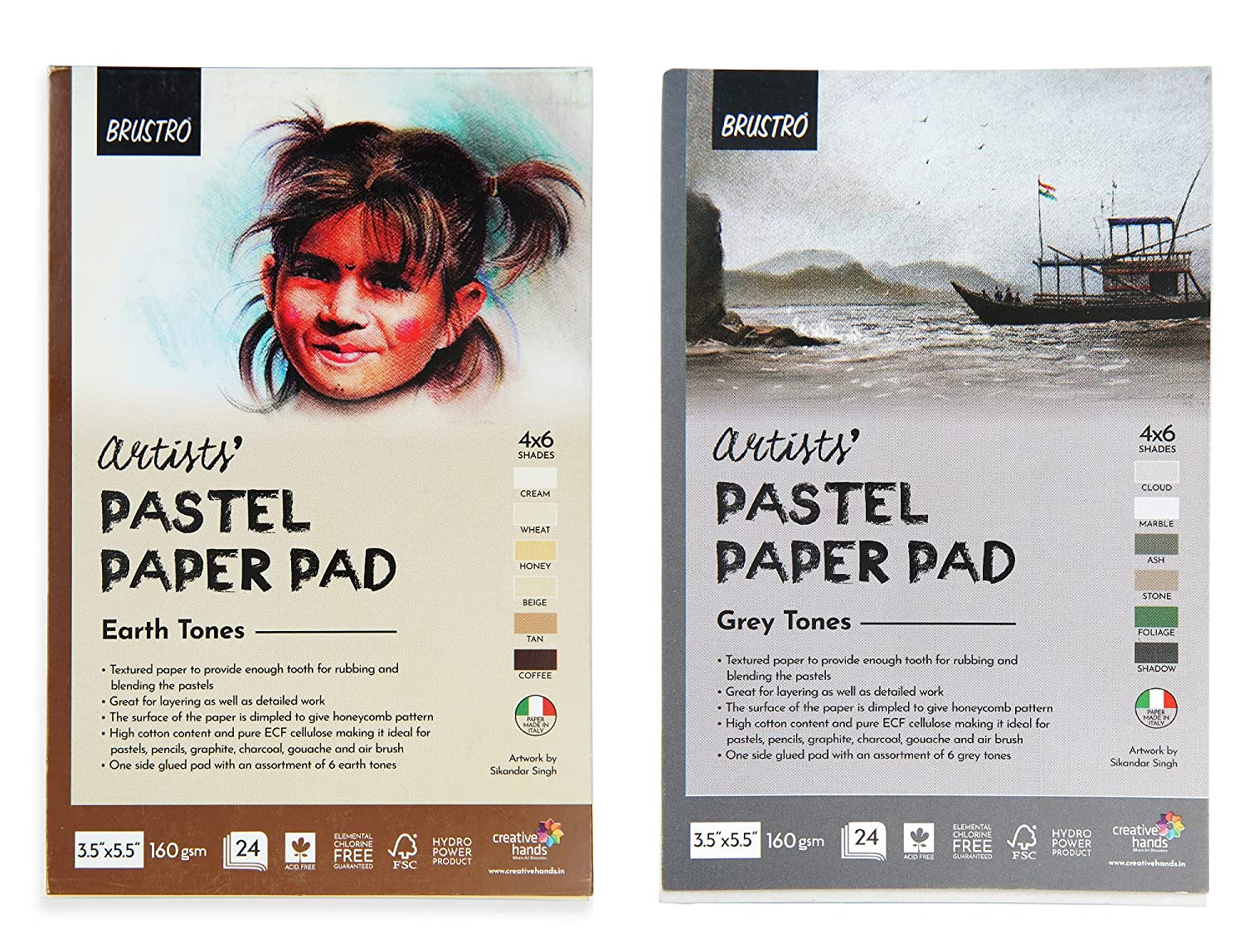 Brustro Artists' Pastel Paper Pad Set of 2, 24 Sheets (160 GSM) Each, Colour - Earth Tones & Grey Tones, Size - 3.5" x 5.5"