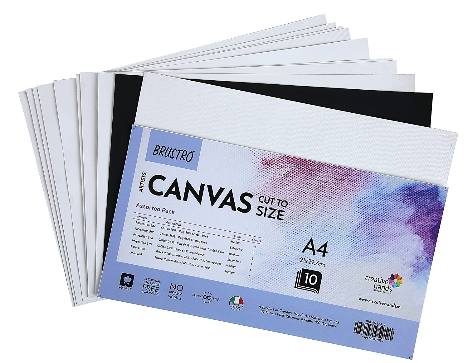 - Comes in an assorted pack of 10 pre-cut canvas cloths in A4 size (21x29.7 cm)