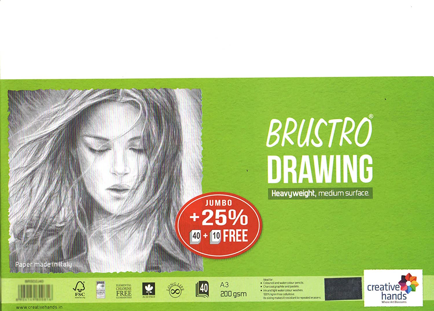 Brustro Sketching & Drawing papers are made of high-quality lignin-free and acid-free cellulose, guaranteeing long conservation over time. Produced with 100% of E.C.F. pulp (Elemental Chlorine Free). Its internal and external sizing renders it resistant to repeated erasures. It is recommended for artists and amateurs for sketching and drawing with pencil, charcoal, pastel, coloured pencil and ink. It is also suitable for gouache. Brustro is a registered trademark of Creative Hands Art Materials Pvt. Ltd.
