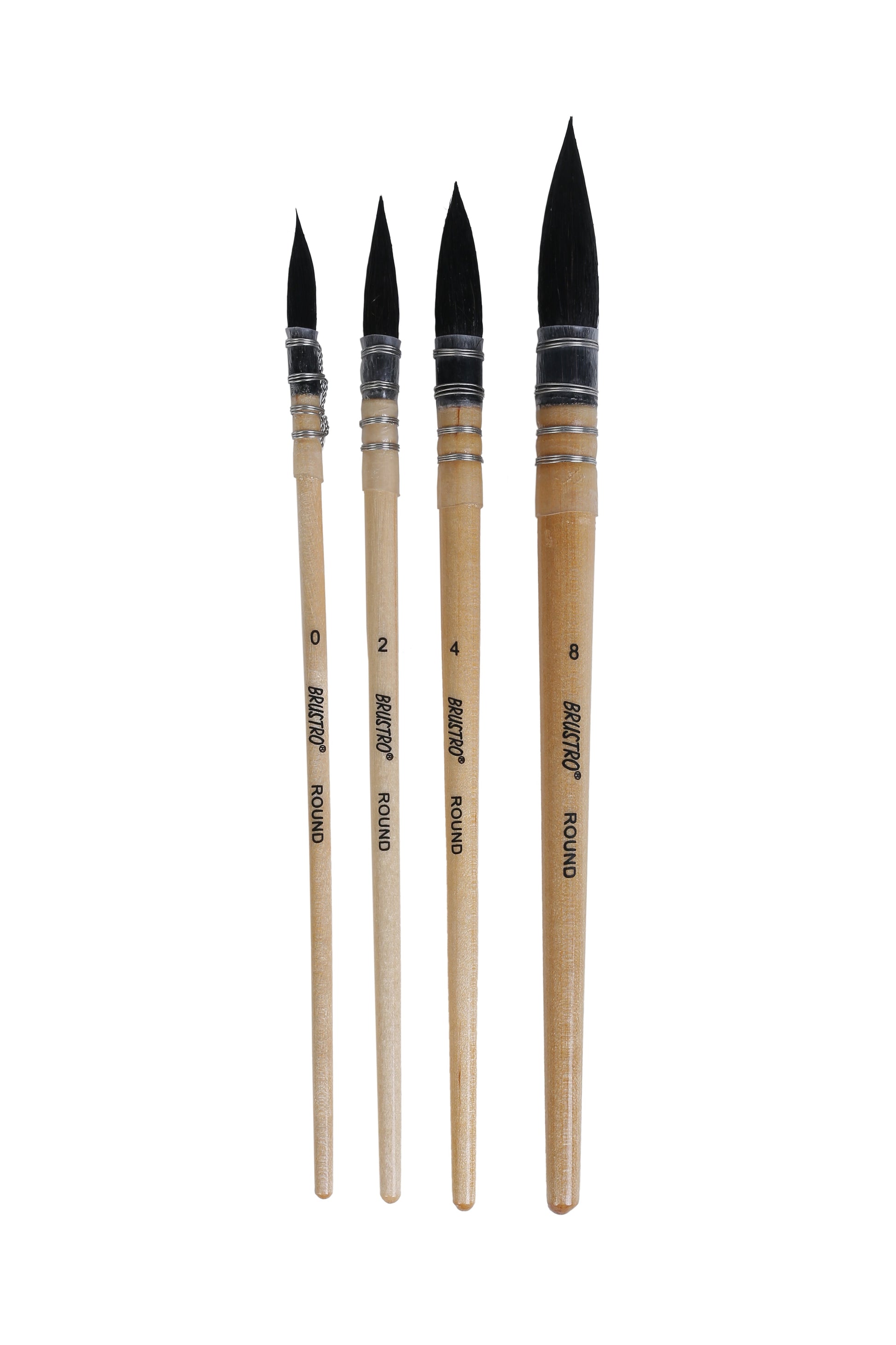 BRUSTRO Artist's Natural Hair MOP Brush | Set of 4 - (0, 2, 4, 8) | Ideal for Watercolor, Synthetic, Blend, Round Paint Brush, Art Painting, Colour, Gouache, Wooden Handle, Professional and Students
