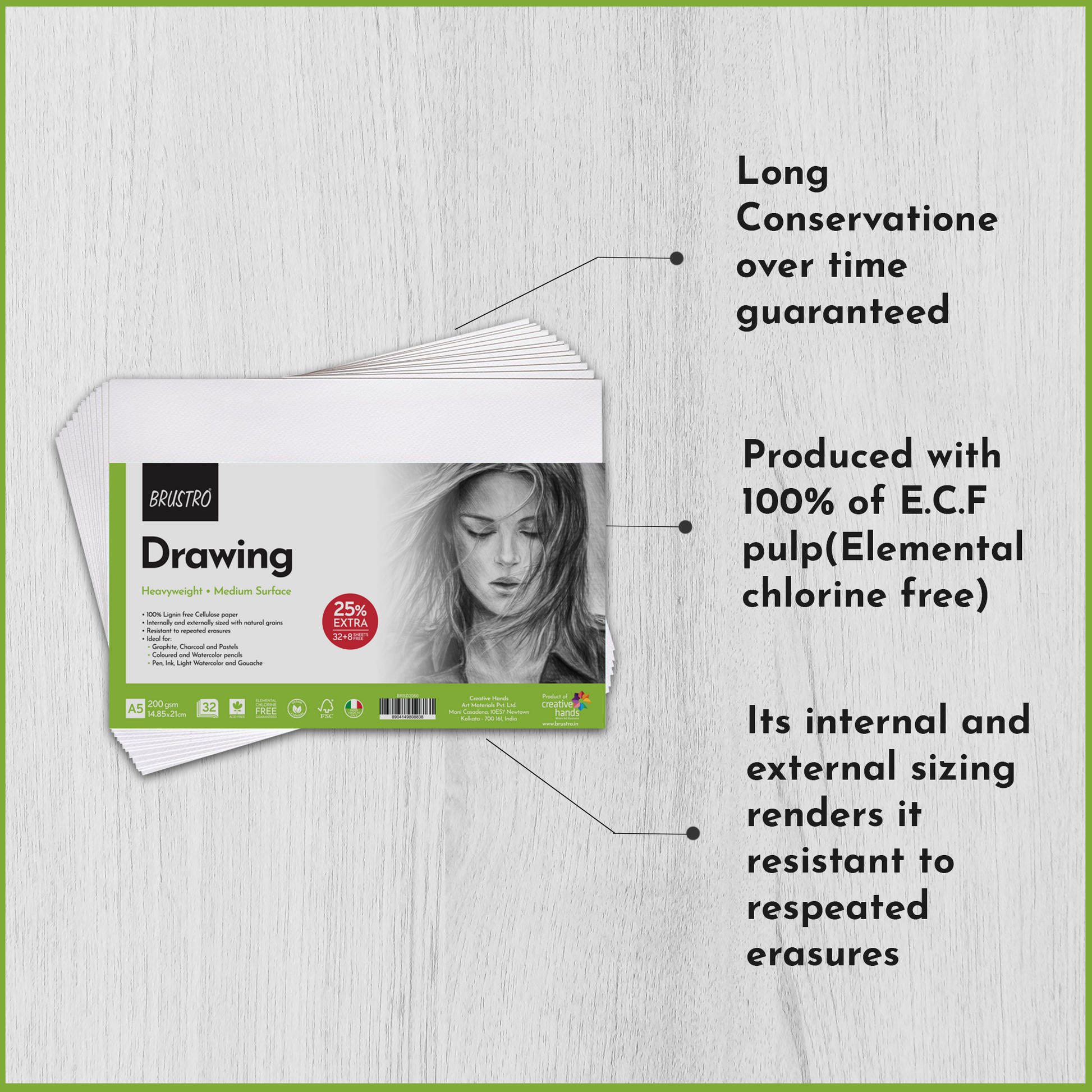 Brustro Sketching & Drawing papers are made of high-quality lignin-free and acid-free cellulose, guaranteeing long conservation over time. Produced with 100% of E.C.F. pulp (Elemental Chlorine Free). Its internal and external sizing renders it resistant to repeated erasures. It is recommended for artists and amateurs for sketching and drawing with pencil, charcoal, pastel, coloured pencil, and ink. It is also suitable for gouache. Brustro is a registered trademark of Creative Hands Art Materials Pvt. Ltd.