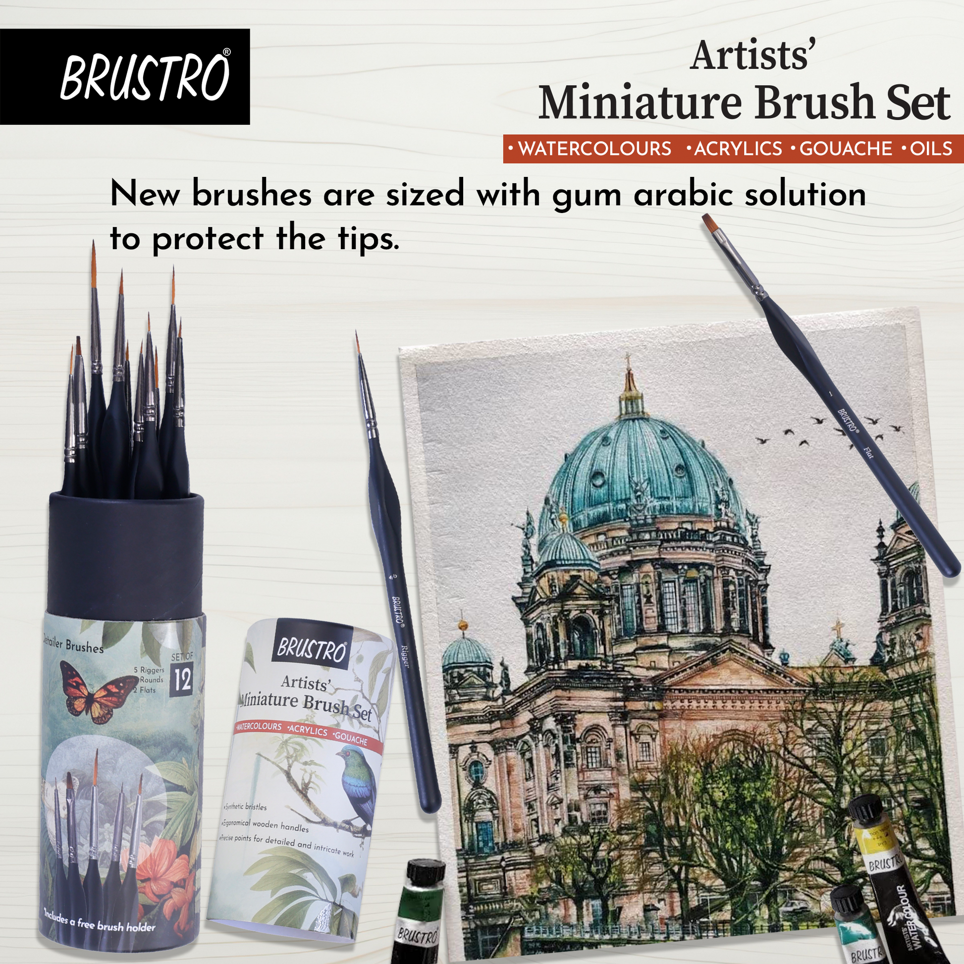 - BRUSTRO ARTISTS' MINIATURE BRUSH SET For minute detailing. Watercolours/ Acrylics Set of 12 Precise points for detailed and intricate work. Ergonomic handles. Synthetic bristles. Detailing brushes include: Riggers: 1, 0, 2/0, 3/0, 4/0 Rounds: 1, 0, 2/0, 3/0, 4/0 Flats: 1,0. Includes a free brush holder. Brush care tips: 1. New brushes are sized with Gum Arabic solution to protect their tip. Gently brush the tips in your palms using cool water. 2. Always reshape the brush to its original condition after every use by shaking out excess water. 3. Always clean your brush immediately after painting. 4. Never leave brushes standing upright in a jar of water. 5. Avoid soaking the wooden handle and always dry it after washing and cleaning.