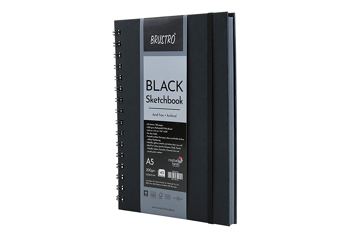 BRUSTRO Black Sketchbook | A5, 200GSM | 40 Sheets/80 Pages | Wiro Bound, Spiral, Premium, Acid-free Paper, Professional-Grade, Ideal for Dry media, Mandala art, Graphite, Charcoal, School, Office use