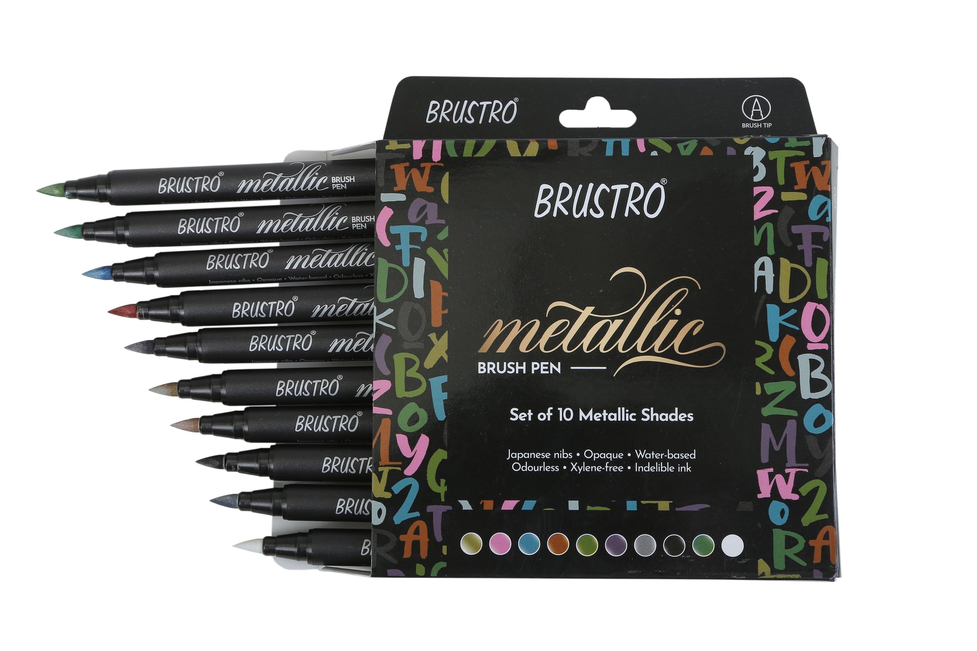 BRUSTRO Metallic Brush Pens - Soft Brush Tip for Calligraphy, Hand Lettering, Colouring, Scrapbooking, Card Making - Set of 10 Colors.