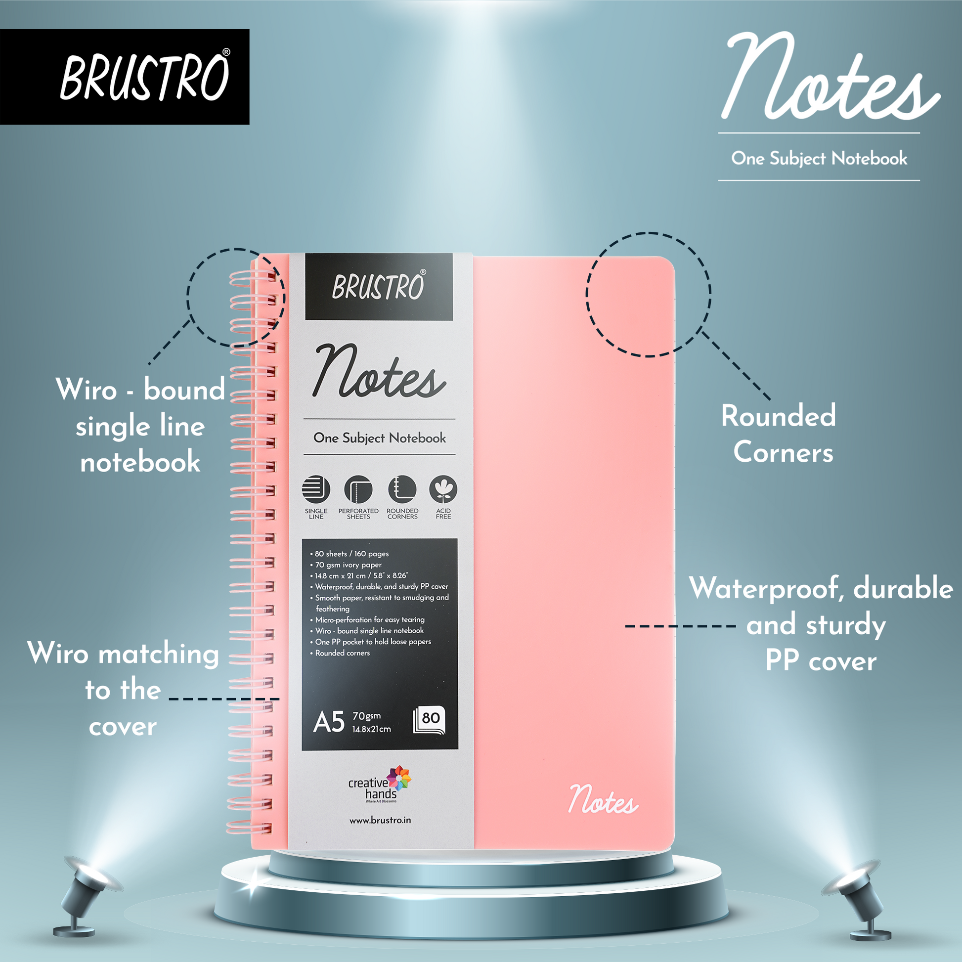 BRUSTRO Notes A5 Size, 1 Subject Ruled Notebook, 80 sheets / 160 pages, 70 gsm ivory paper, Blush Cover
