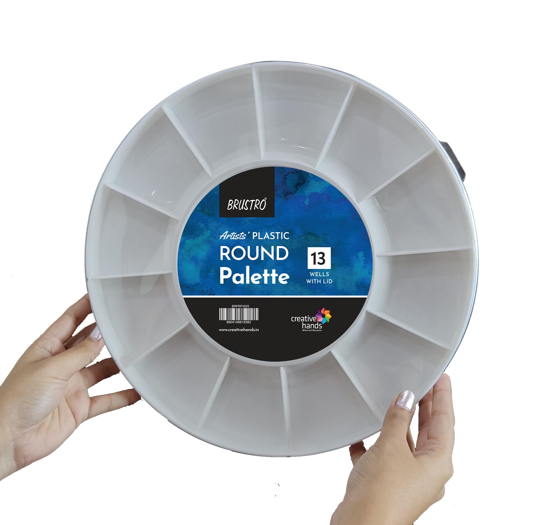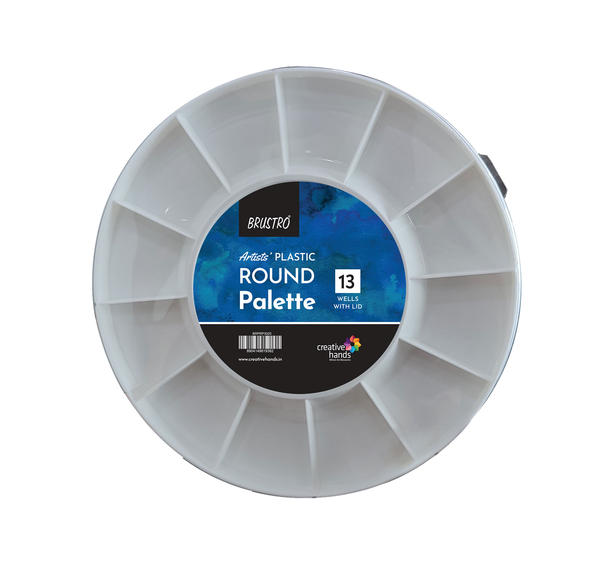 Brustro Circular plastic palette with 12 uniform wells and a central large mixing area. It Comes with a clear lid for easy cover up when the palette is not in use.