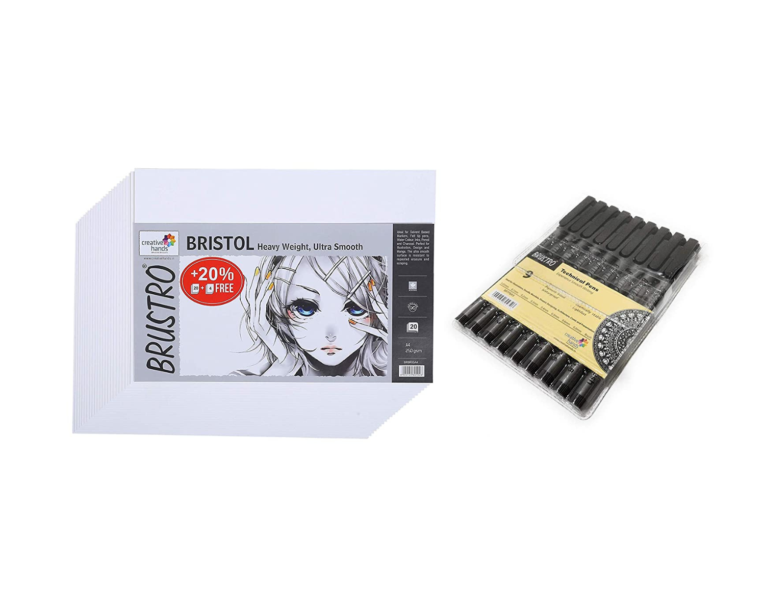 BRUSTRO Technical Pens Fineliner Set|Black| Set of 9|Ideal for Students,Adults|Doodle,Mandala,Fineart,Outline,Waterproof,Architecture,Technical Drawingwith Bristol Ultra Smooth A4 Size ( 20 +4 Sheets )