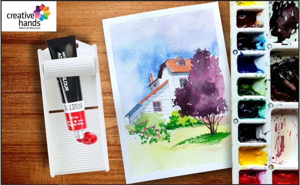 A plastic ribbed tool with roller which runs in channels, gripping and squeezing paint up to 200ml in size from the bottom of the tube.