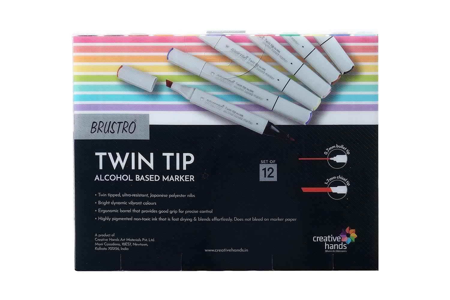 - A unique,ergonomic design,non-toxic alcohol based quality ink and ultra resistant fiber nibs produced in Japan,a Brustro marker consists of two tip sizes. Excellent smudge-proof & waterproof qualities on most surfaces