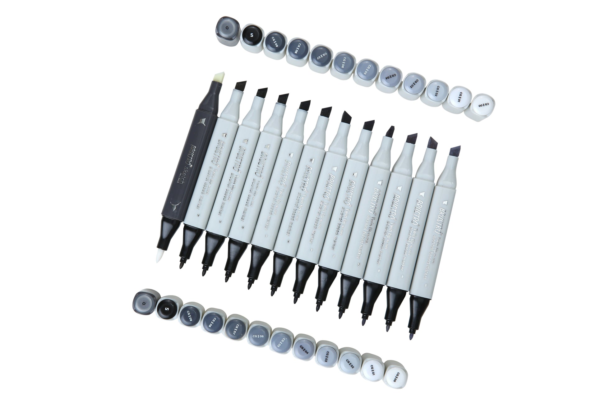 - Set of 12 Cool Grey Shades in a Transparent Plastic Box. Highly compatible with Brustro Bleedproof Marker Papers 70 GSM