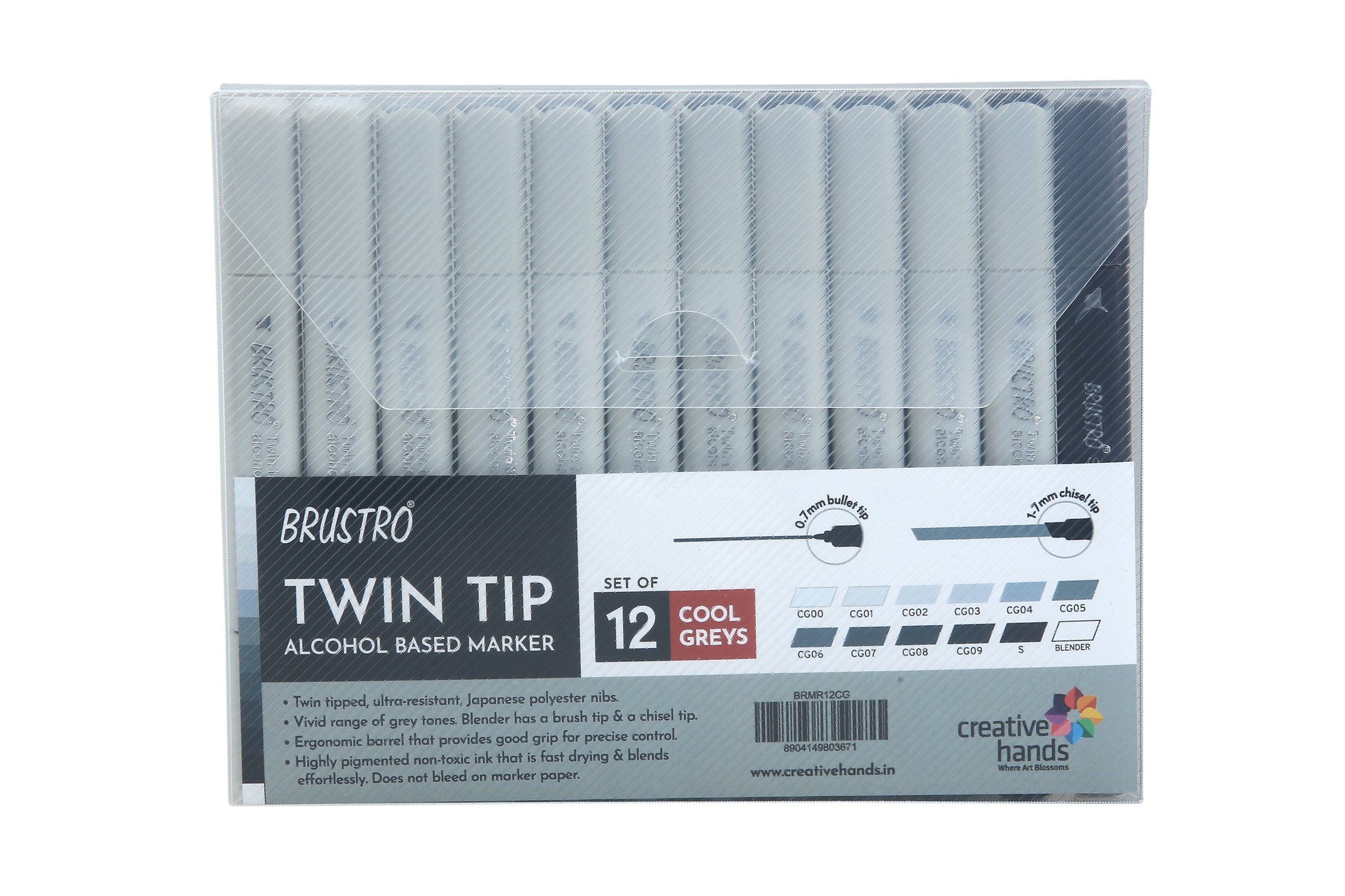 BRUSTRO Twin Tip Alcohol Based Marker Set of 12 - Cool Greys in Crossline PP See Through Box