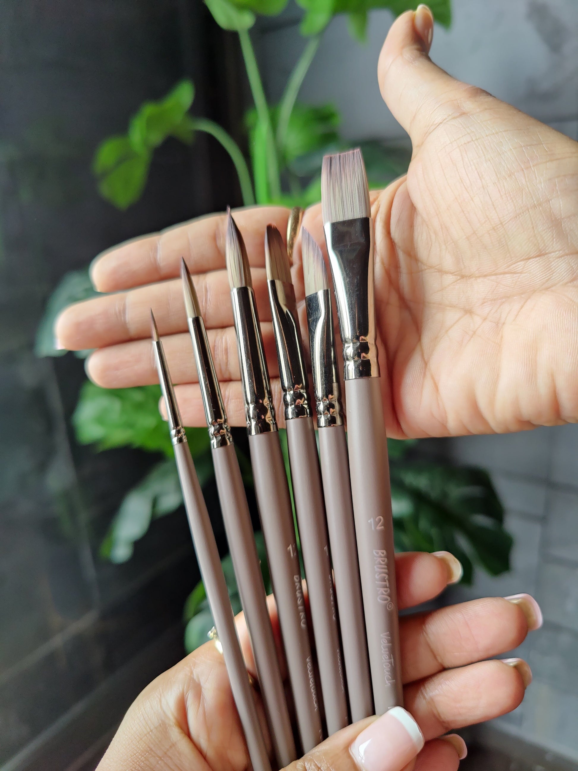 1.These synthetic hair brushes mimic the characteristics of natural hair brushes and are more durable, easier to clean, and tend to retain their shape. 2.The shorter handle provides better control and precision, allowing artists to work closer to the paper and have more control over their brushstrokes. 3. They have a good paint holding capacity, allowing artists to easily to hold and release paint smoothly. Since Gouache and acrylic paints are thicker, the slight stiffness of the bristles helps to manipulate the paint effectively. 4. These brushes offer a good amount of spring and resilience. They can snap back to their original shape after each stroke. 5.This set comes with 3 rounds, one dagger, one flat and one filbert making it suitable for various strokes like detailing, washes, blocking, blending and filling small areas.