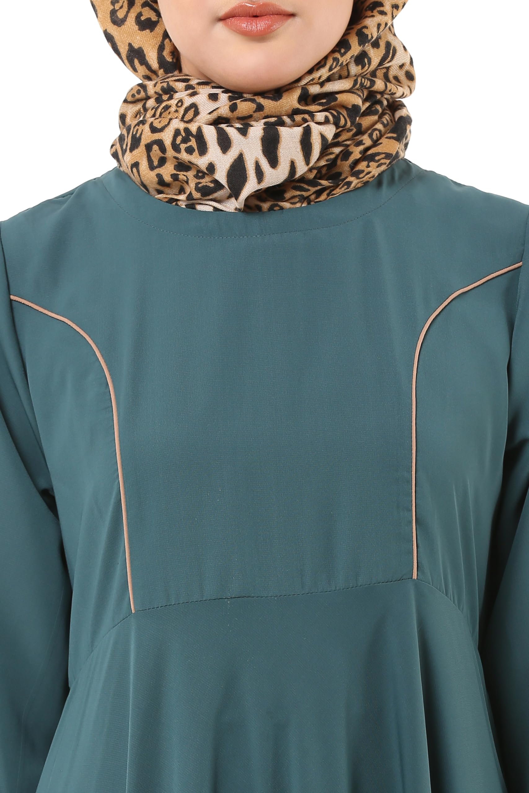 This full flared umbrella cut abaya dress is a pure piece of sophistication with long cuff sleeves, it has beautiful piping work on chest and round neckline, frock-style appearance, Sleeves come with long cuffs for the grip. Made from comfortable Nida matt fabric, it is lightweight, soft and comfortable. The modest abaya looks beautiful with its flowy bottom for lovely movement and extra modesty.
