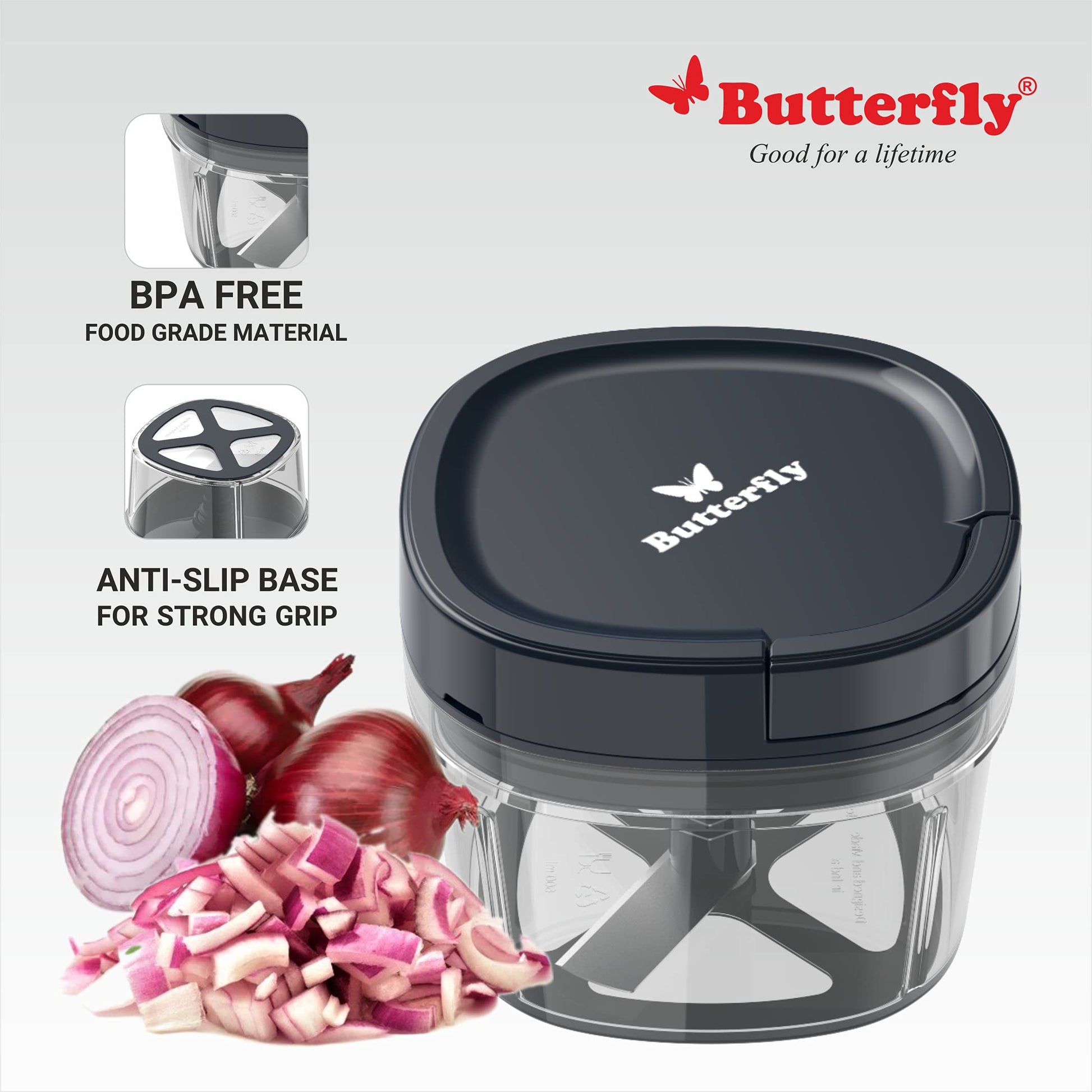 Details: Butterfly Hero Mixer Grinder, 500W, 3 Jars (Grey)The Butterfly Hero 500 -watt mixer grinder with its stainless steel jars and sleek finish ticks both the boxes of durability and design. Consuming 230 Volts, the mixer grinder is an energy-efficient device, Beautifully designed, this value-for-money product will surely serve your purpose of reducing preparation time by hours.Butterfly Premium Vegetable Chopper 600 ml BlueButterfly Presents a Premium Vegetable Chopper it chops All Types of Vegetables and Fruits with Ease. It is is suitable to cut and chop your vegetables, dry fruits, nuts, etc. into tiny pieces with just few pulls of the chord. Make salad, gravy, paste, etc. more easily and quickly.