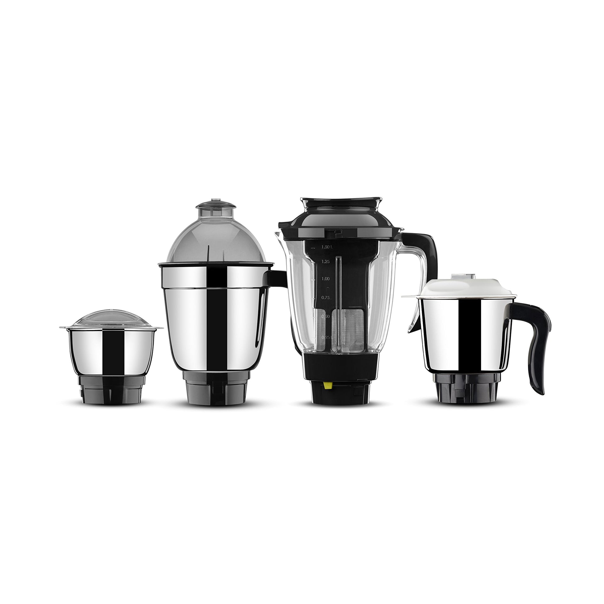 - No of Jars: 4; Jar Size: 0.4,0.75,1 in Ltr; Jar Material: Stainless Steel jars and PC Juicer Jar; Body Material: ABS body; Cord Material: 180 CM; Blade Material: Stainless Steel; Speed Control: 3 Speed motor for faster and efficient grinding.Body: Body made of ABS which is shock free