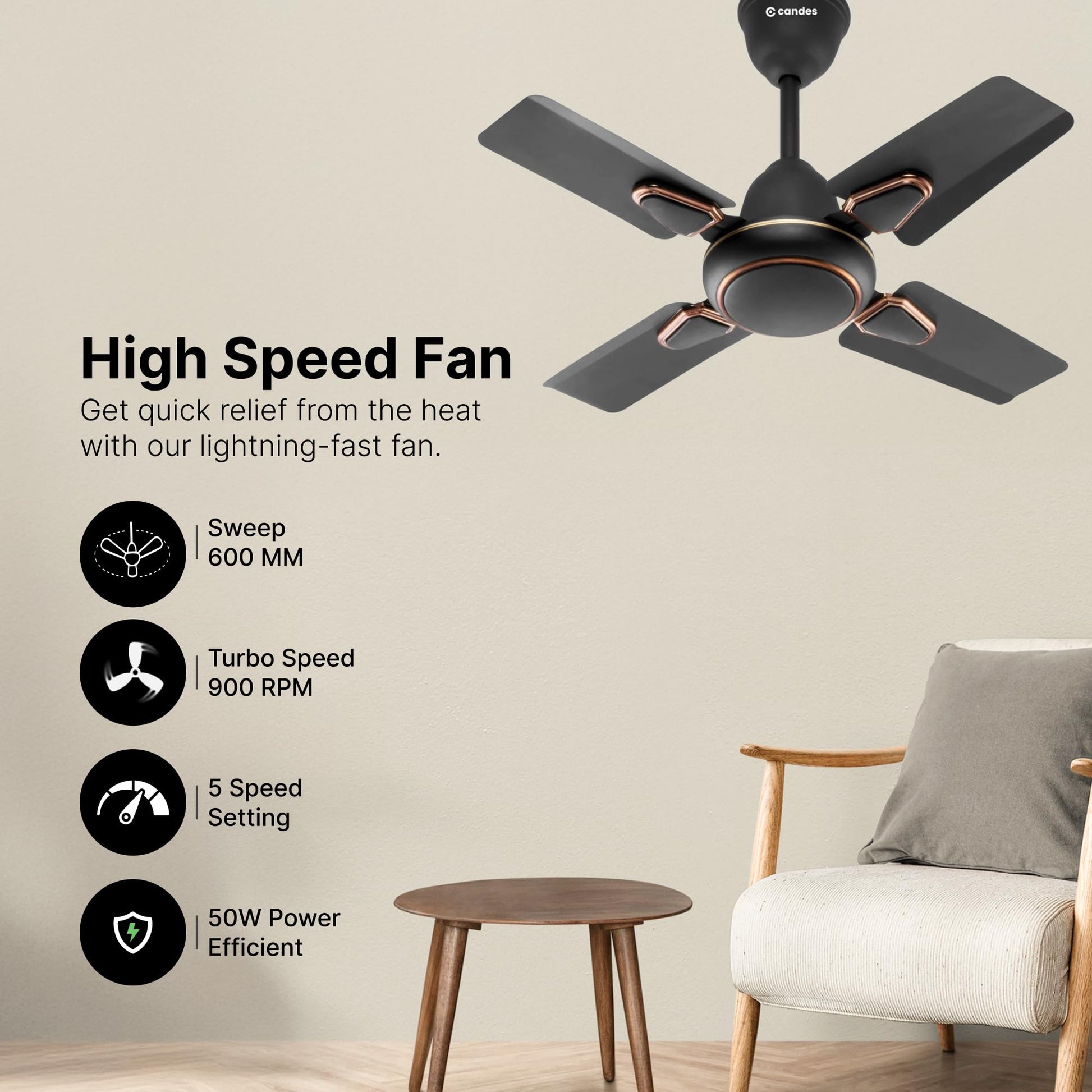 Candes Brio Turbo 600 mm / 24 Inch High Speed 4 Blade Anti-Dust Ceiling Fan Suitable for Kitchen/Veranda/Balcony/Small Room (Pack of 1,Smoke Brown)