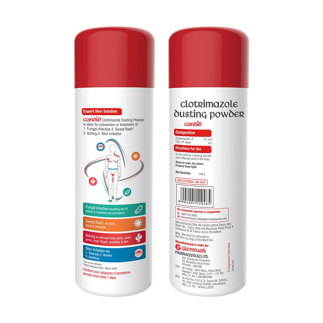 Details: Candid Dusting Powder is an expert solution to skin problems. During the summers, you may develop fungal infections because of sweating due to heat. Candid Dusting Powder comes in handy while dealing with this problem. Not only does it protect you against the fungal infection, but it also provides you relief from the sweat rash that occurs on the neck, back and shoulders. Candid Dusting Powder contains Clotrimazole, an effective antifungal ingredient that annihilates the cell membranes of fungi to stop their growth.