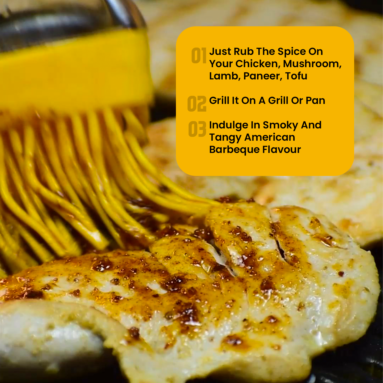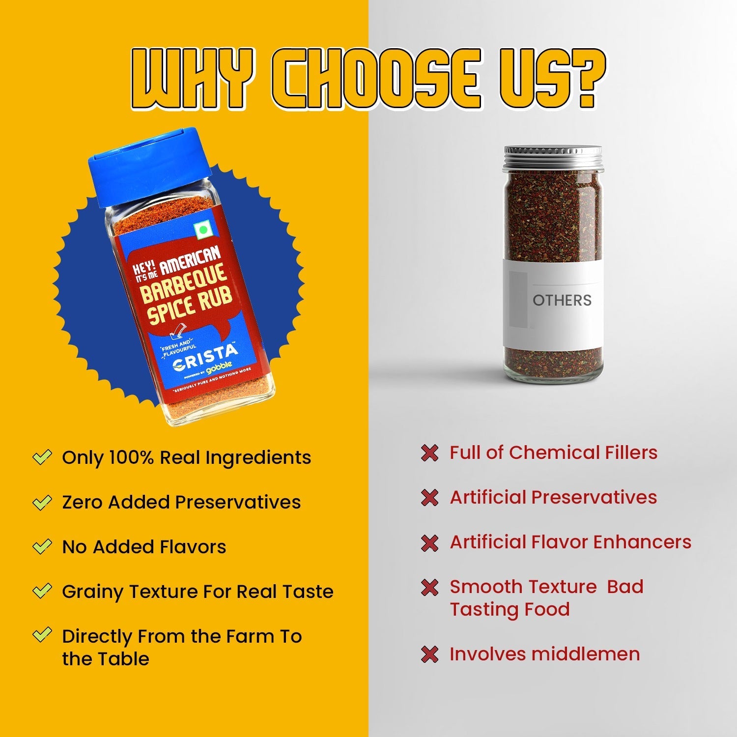 Hey! Its me American Barbeque Spice Rub. A personal favourite of our Founder at CRISTA, this complex blend is a flavourful, versatile, spicy amalgamation of premium dry whole and ground spices that serve as a key ingredient for people that love to grill! The versatility of this blend allows it to be used to season lamb, pork, chicken, fish or beef. It can be added to marinades or sprinkled directly on grilled vegetables. Freshly machine ground using our sophisticated hammer crushers and micro pulverisers, the blend is subsequently mixed in an automatic GMP blender to achieve the desired balance and consistency. Scan the QR code on the bottle for a lip-smacking recipe.