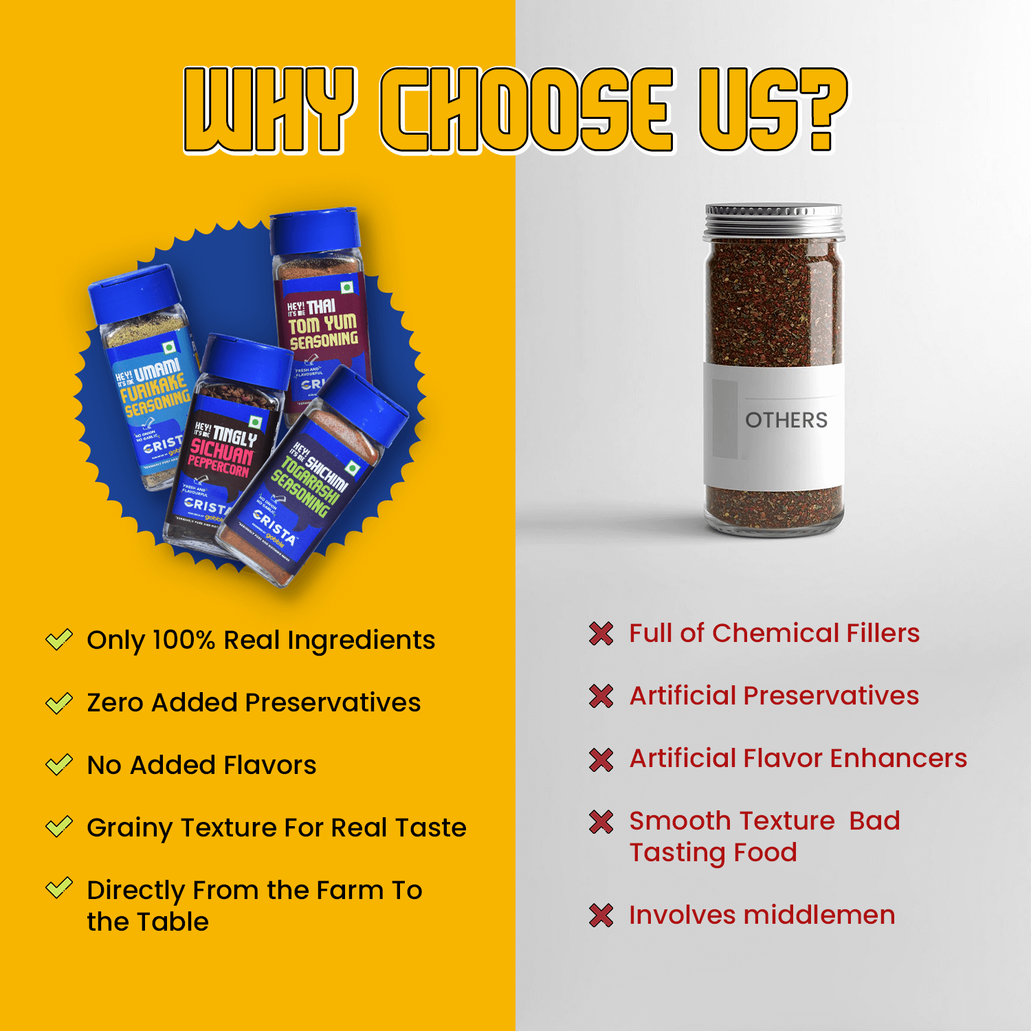 CRISTA Spices & Seasonings Combo Packs are curated based on utility, need and practical consumption of most Indian households. Select from multiple Combo Packs across categories of Whole Spices, Ground Spices, Indian Spice Blends and International Seasonings.