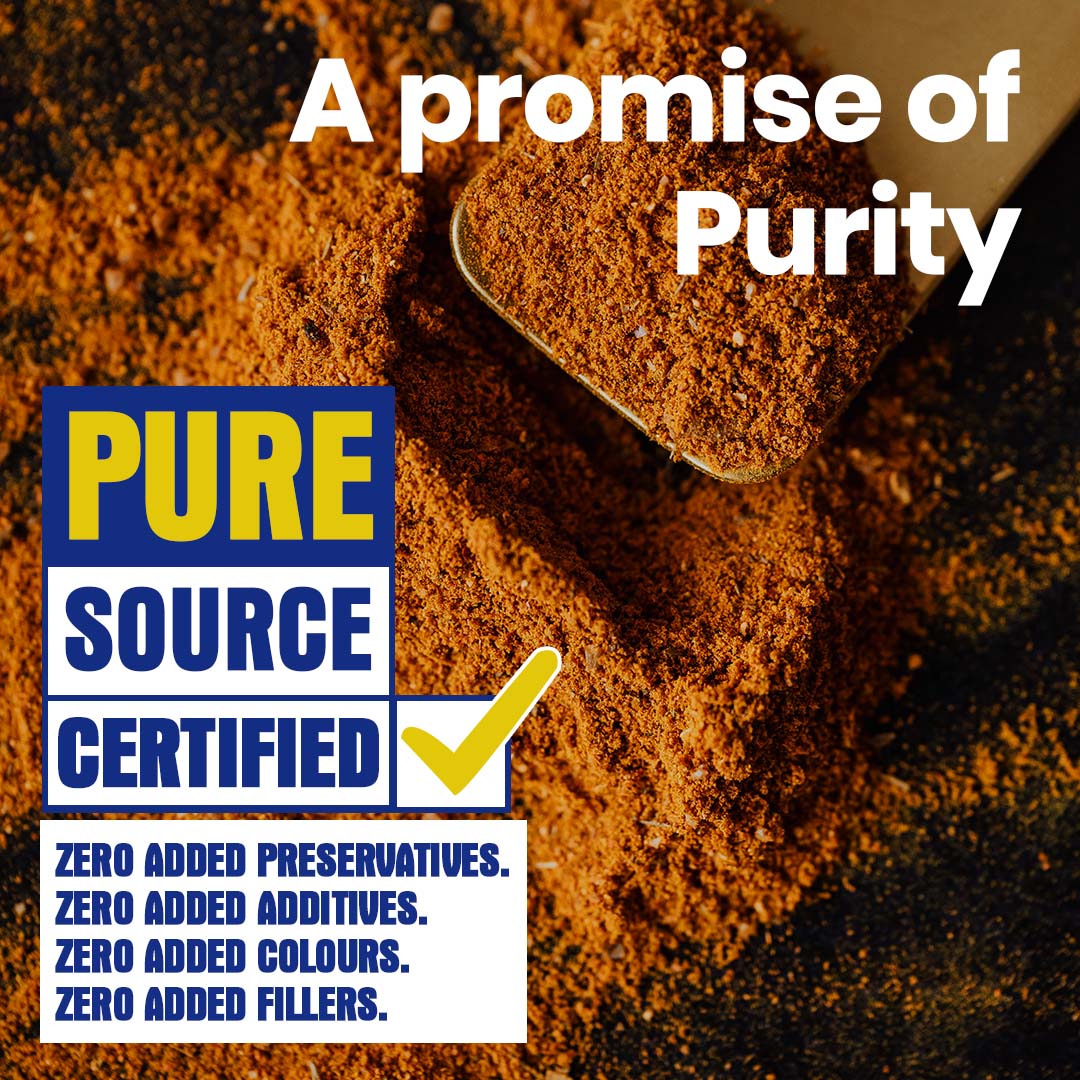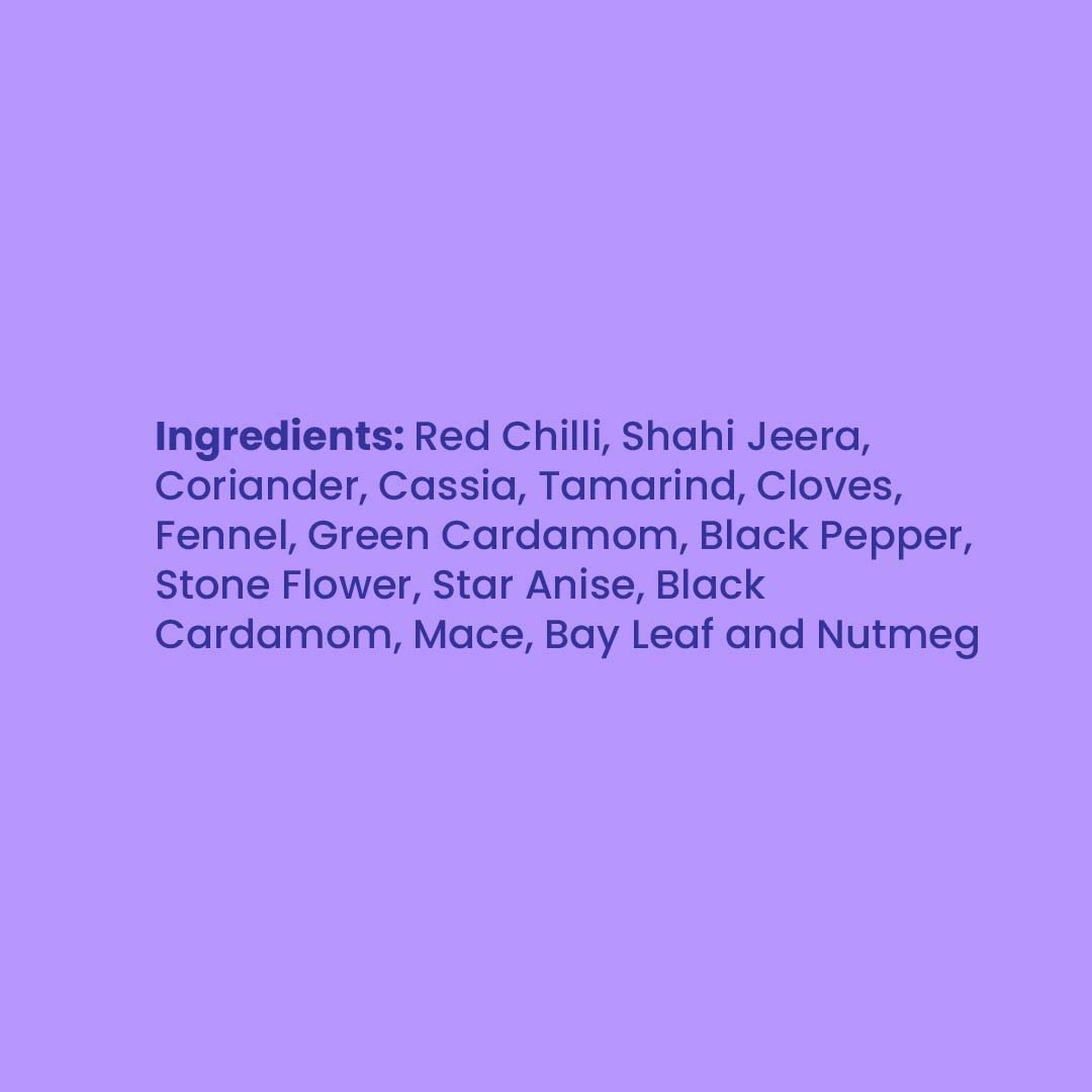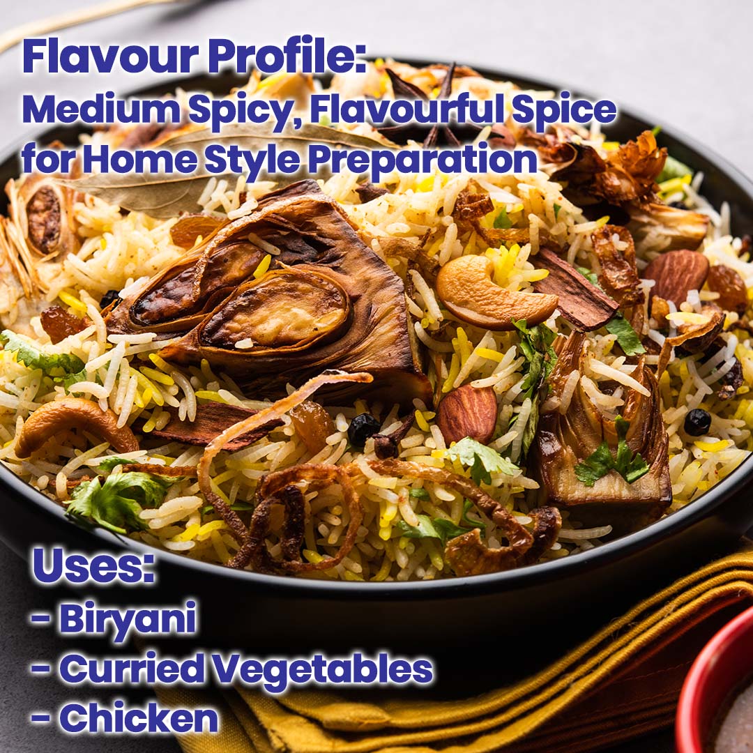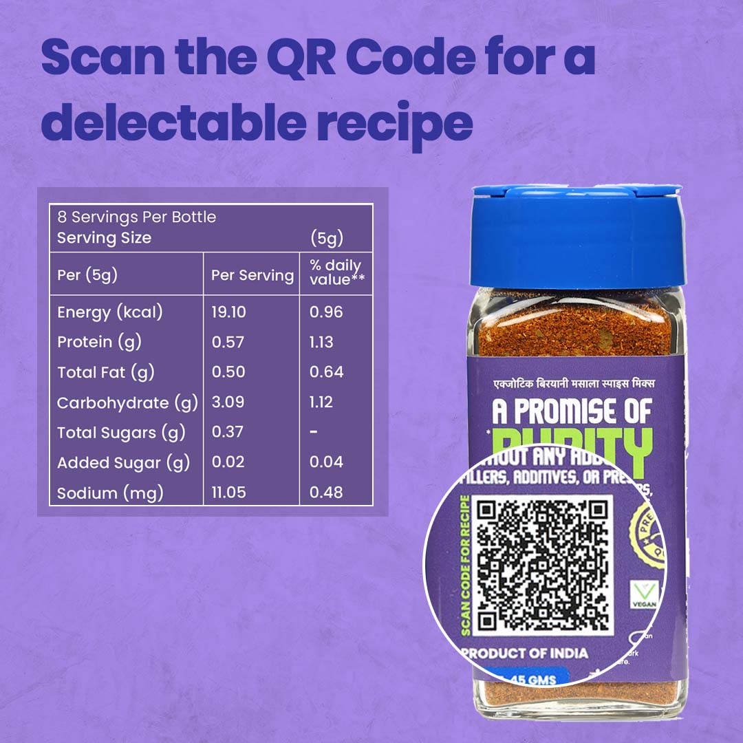 Hey! Its me Exotic Biryani Masala Spice Mix. This popular blend of goodness is used for flavoursome biryani at home whilst also being used to cook curried vegetables and chicken. Freshly machine ground using our sophisticated hammer crushers and micro pulverisers, the blend is later mixed in an automatic GMP blender to achieve the desired balance, texture and consistency. Scan the QR code on the bottle for a lip-smacking recipe.
