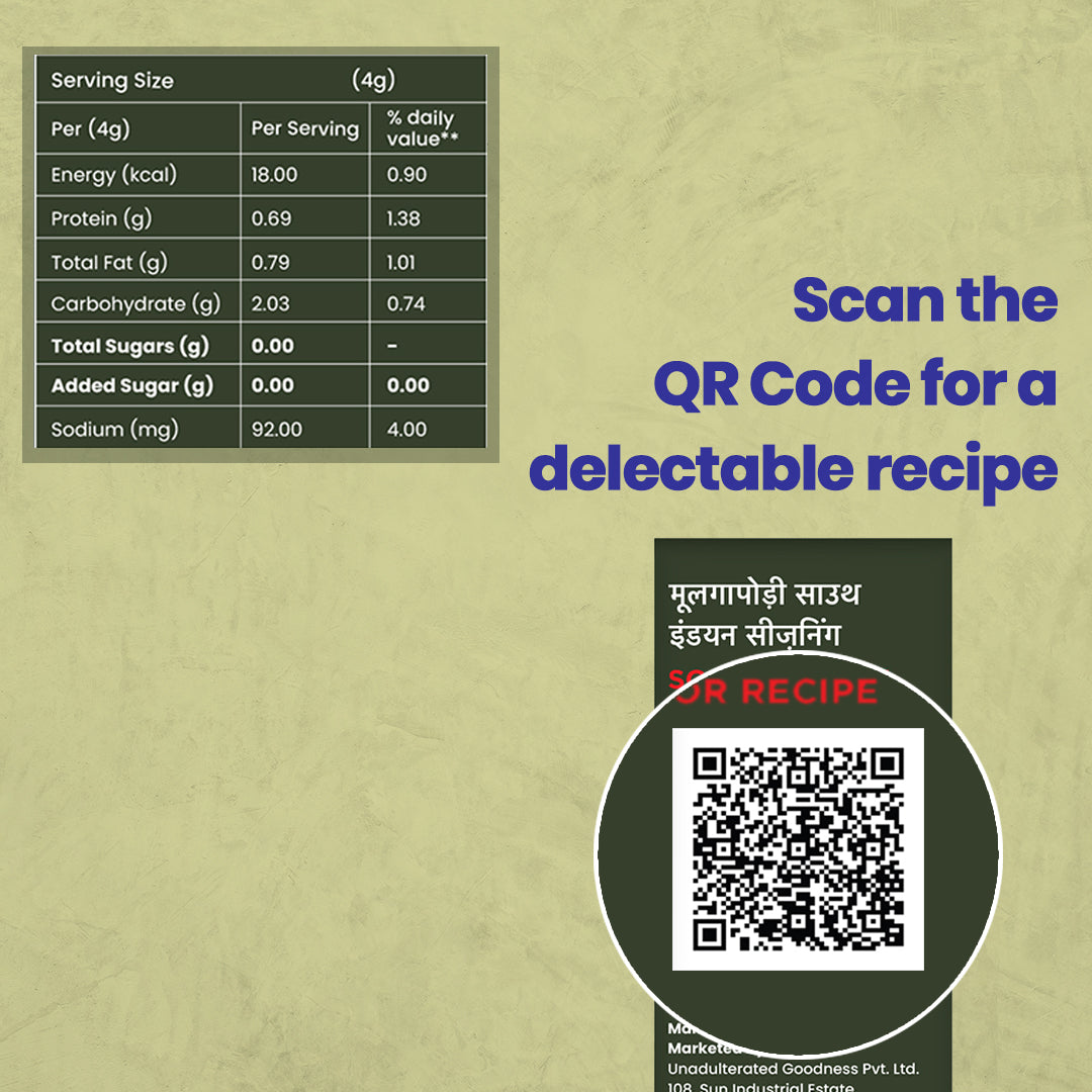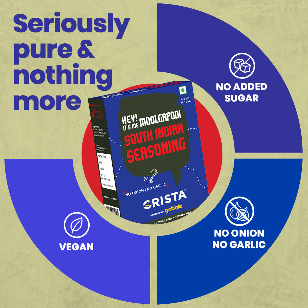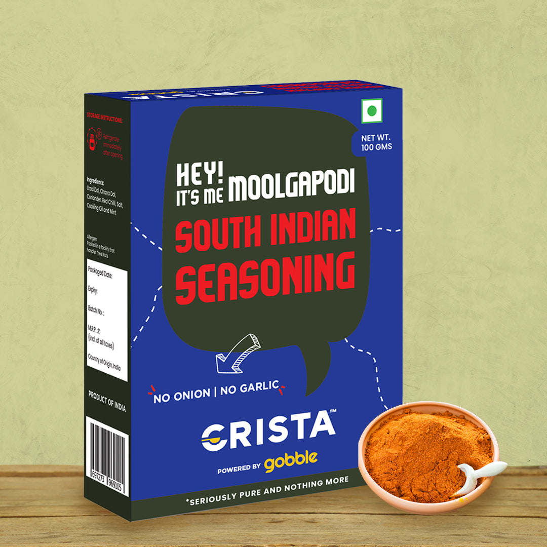 Hey! Its me Moolgapodi South Indian Seasoning. Popularly known as âMoolgapodiâ, CRISTA Moolgapodi South Indian Seasoning is used in an array of South Indian dishes ranging from dosas, idlis, uttapam to wadas. With a spicy and tangy flavour profile, this multipurpose seasoning is fast gaining popularity with the experimental Gen Z and millennial population in India. It is also a favourite of kids! Freshly machine ground using our sophisticated hammer crushers and micro pulverisers, the blend is mixed in an automatic GMP blender to achieve the desired balance and consistency.