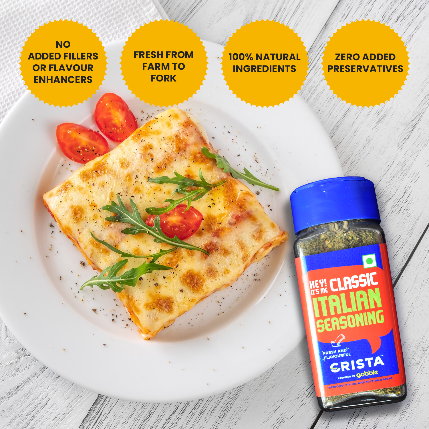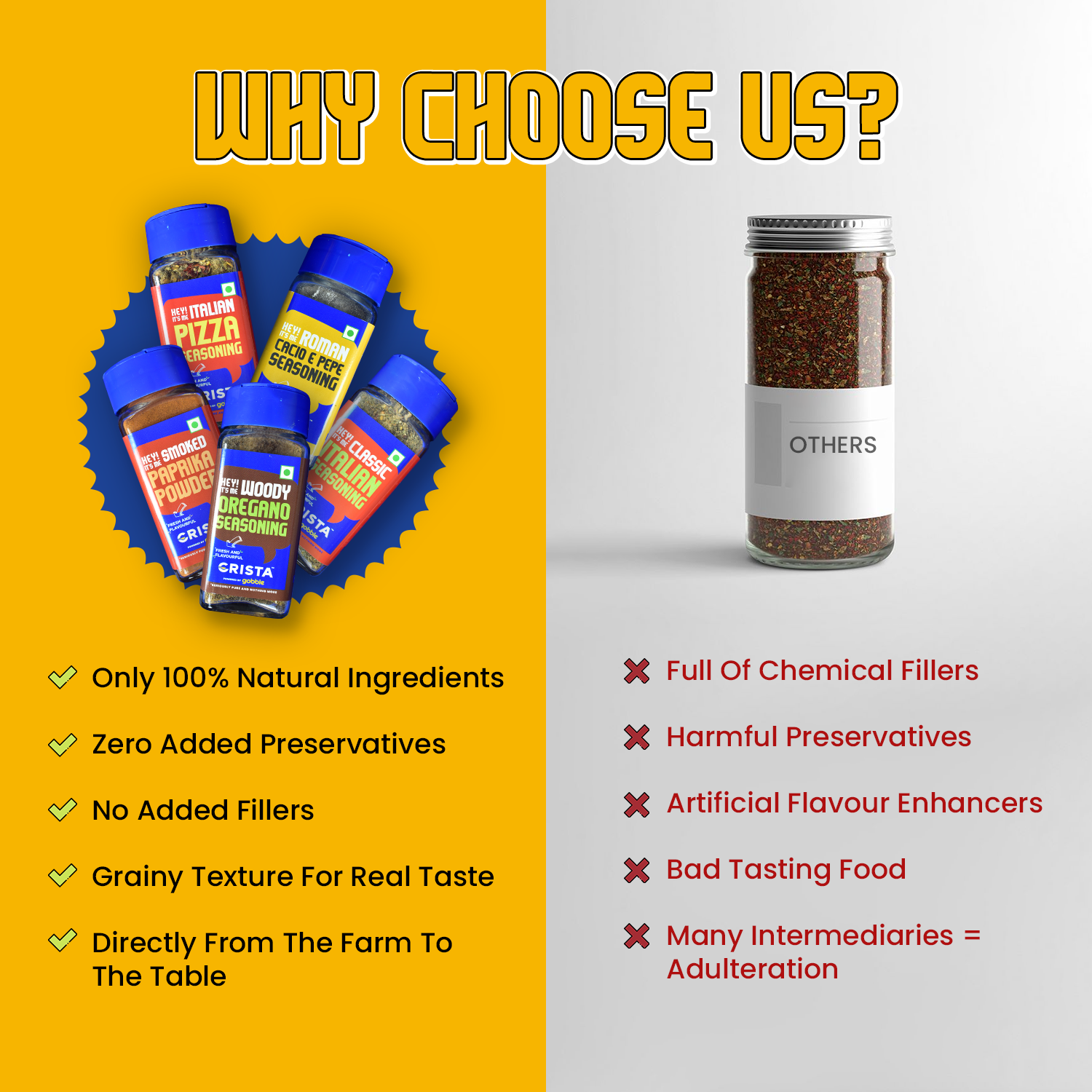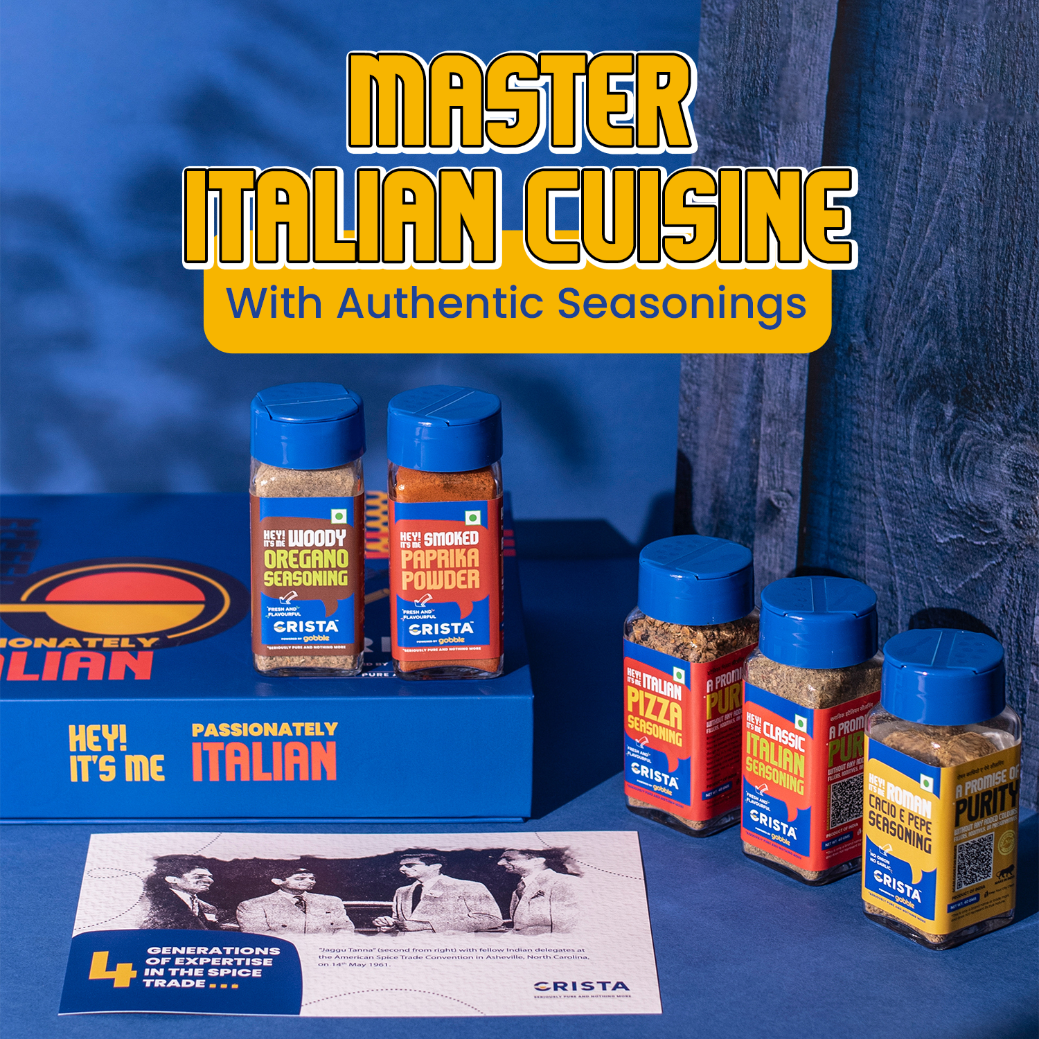 CRISTA Seasonings Gift Boxes are a series of six unique and modern theme oriented gift boxes that consist of a variety of natural, authentic and flavourful Indian and International Seasonings. Baby Showers, Birth Annoucements, Birthdays, Anniversaries, Housewarmings and Festive Occasions like Diwali, Rakshabandhan and Friendship Day are some of the important occasions for which a CRISTA Seasonings Gift Box has been used as the perfect gift to show your appreciation and love towards that special recipient. The Passionately Italian Seasonings Gift Box consists of a modern design, premium packaging and five complex and authentic seasonings and spices that add loads of flavour to any Italian appetizer or entree. Try the earthy yet complex Woody Oregano Seasoning or herb infused Italian Pizza Seasoning for your appetizers or then the very flavourful and delicious Classic Italian Seasoning or Roman Cacio e Pepe Seasoning for pastas. Top of your dish with a judicious use of our signature Smoked Paprika Powder that generates a bit of heat with a lovely smoky essence. The gift box has a product card and note from the 4th generation Founder. Two of the products have a tech enabled QR code offering delectable recipes. CRISTA has pledged 3% of all profits towards various initiatives that empower the families of spice farmers in India.Read Less