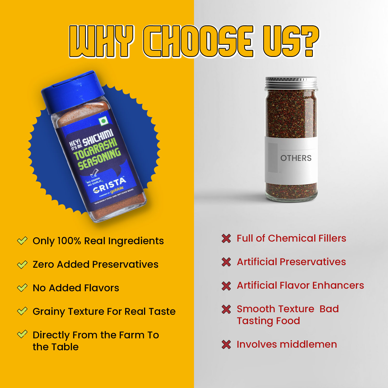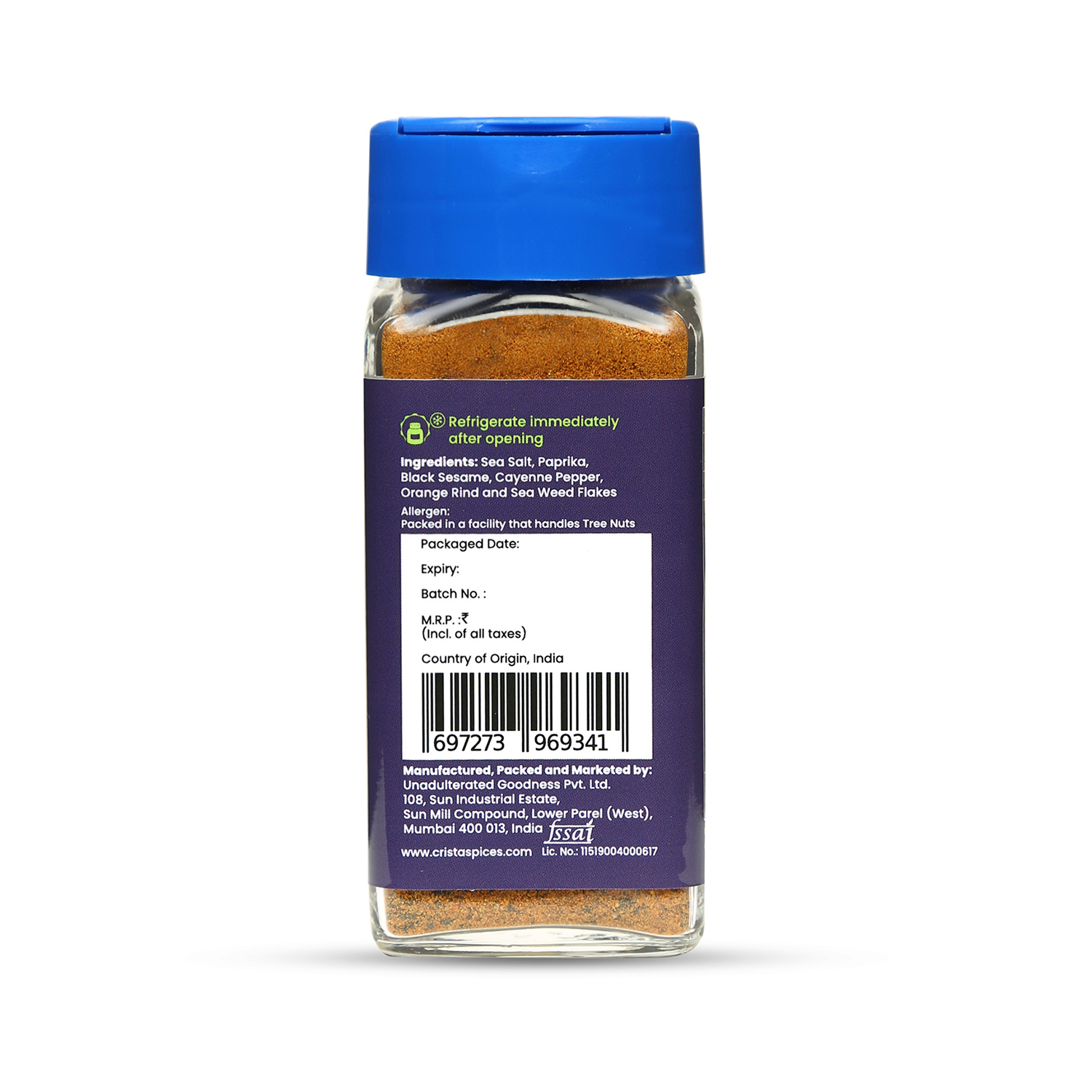 Hey! Its me Shichimi Togarashi Seasoning. CRISTA Shichimi Togarashi Seasoning is a Japanese seasoning used to flavour soups, grilled meats, seafood, noodles and other Asian dishes. Curated for the modern Indian consumer yearning for explosions of complex, spicy flavour without the acid element, this increasingly popular seasoning has notes of mild spice, floral and sweet. In keeping with new age trends of modern experimental cooking, this multipurpose seasoning has been used across wider Asian cuisines and even in dishes such as salmon and rice, slow-cooked eggs, pasta, roasted veggies and seared chicken. Freshly machine ground using our sophisticated hammer crushers and micro pulverisers, the blend is mixed in an automatic GMP blender to achieve the desired balance and consistency.