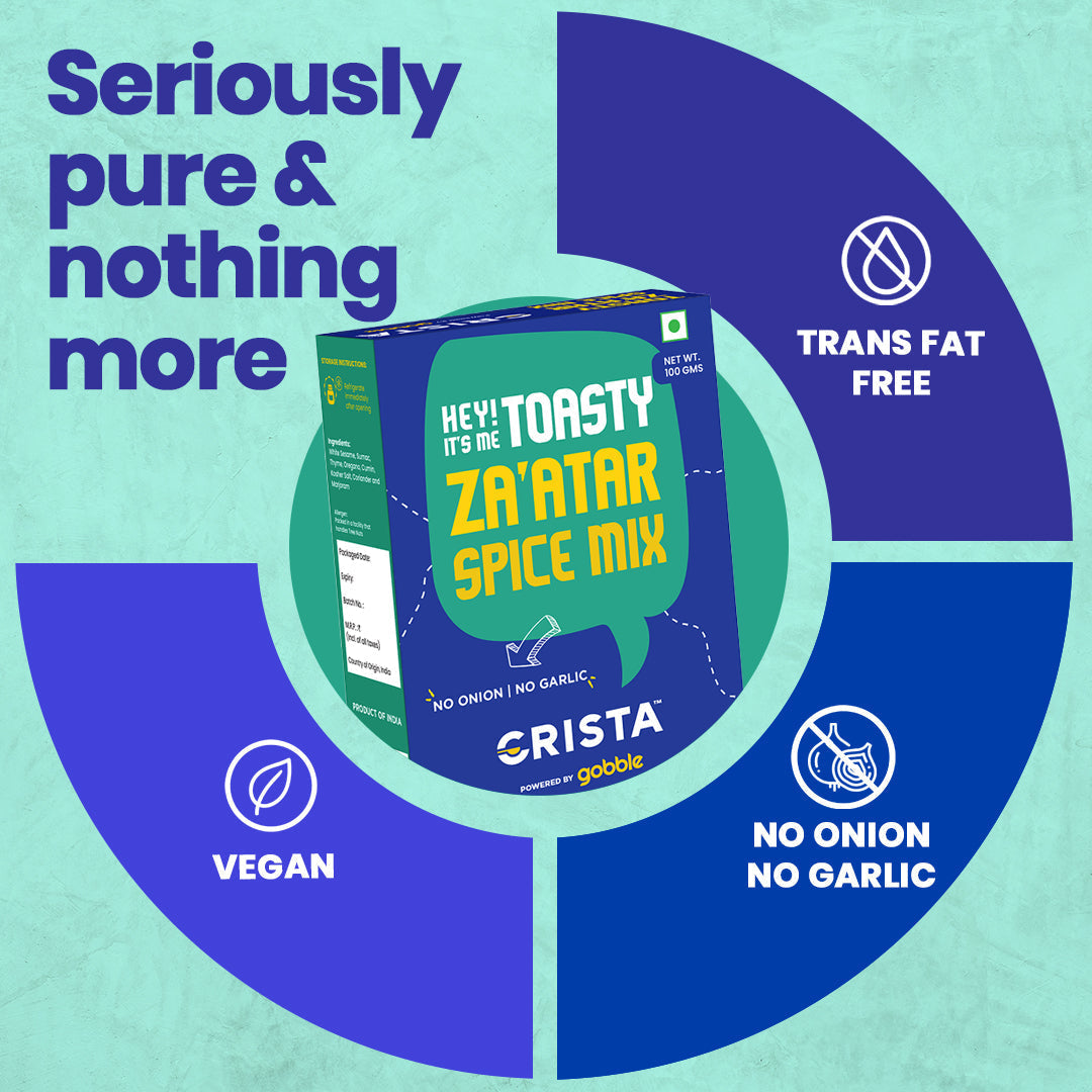 Hey! Its me Toasty Zaâatar Spice Mix. This Middle Eastern proprietary spice blend has emerged as an immensely popular condiment in India. CRISTA Toasty Zaatar Spice Mix has a depth and complexity in flavour and is commonly used as a seasoning for meat and vegetables or sprinkled onto hummus or bread. Freshly machine ground using our sophisticated hammer crushers and micro pulverisers, the blend is mixed in an automatic GMP blender to achieve the desired balance and consistency.